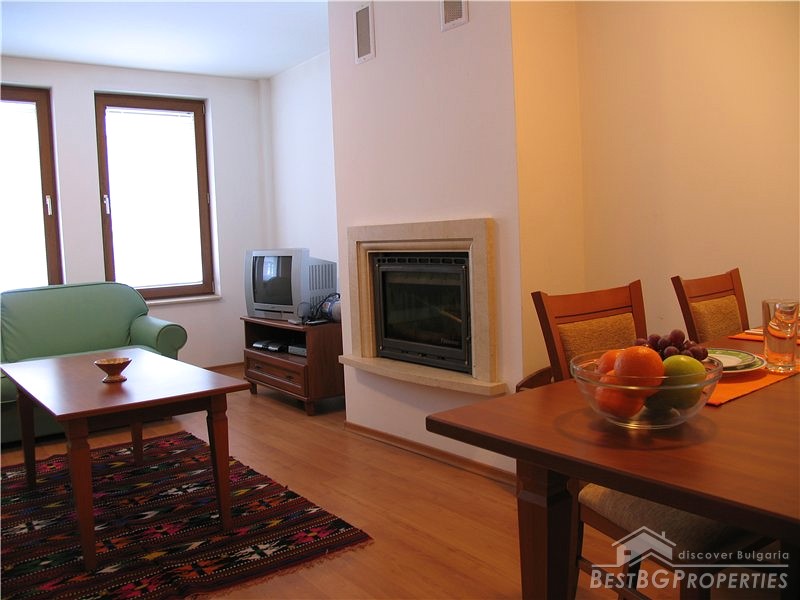 The apartment complex consists of 25 apartments, (3 studios, 20 one bedroom apartments and 2 two bedroom. From the outside the building is finished in the traditional Bulgarian style. From the inside apartments are finished with isolation, they are warm and cozy. The kitchens are furnished with modern equipment and appliances. All of the apartments are furnished with wooden furniture.
