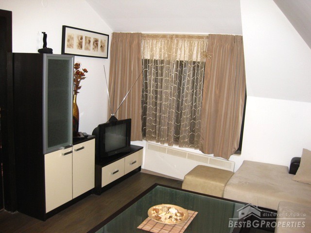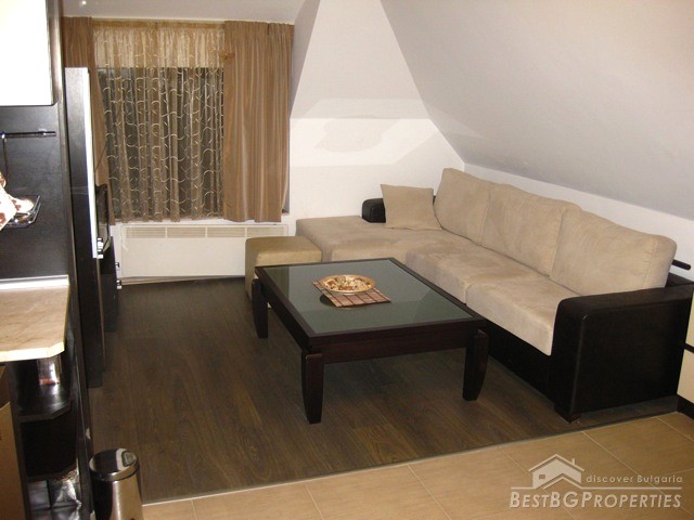 This is a luxury apartment for sale located in the ski resort of Bansko. It is set in a residential apartment building with act 16 and permition for usage, close to the center of the town. The apartment is a one bedroom type and consists of a lounge with a wardrobe for clothes, bathroom with a shower cabin, living room with dining area and kitchen box, and one bedroom. The apartment has total living area of 52 sq m of which only 2 sq m are the common parts.