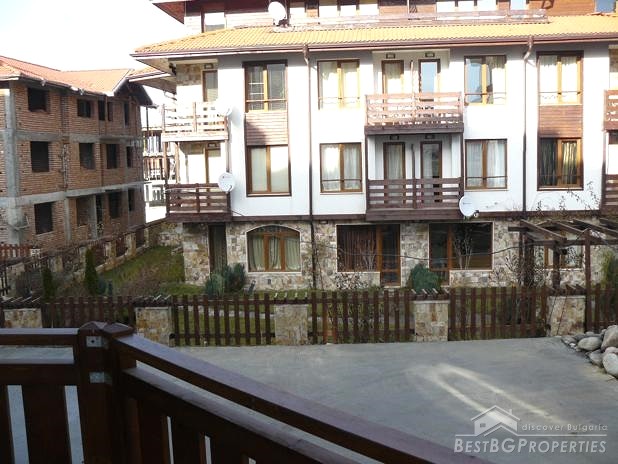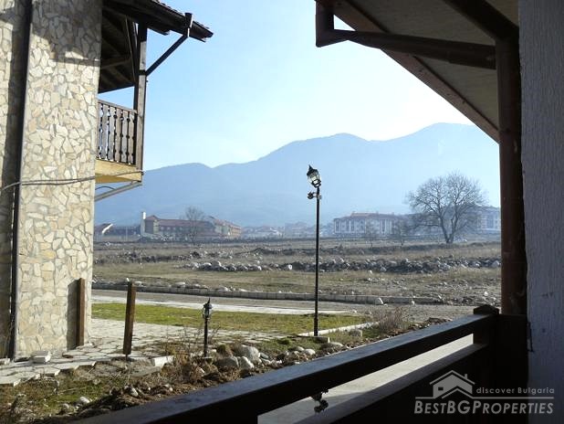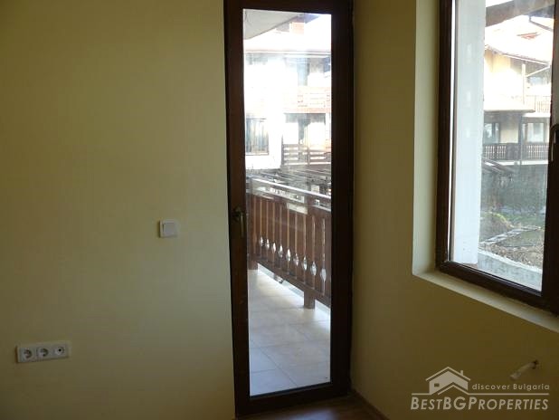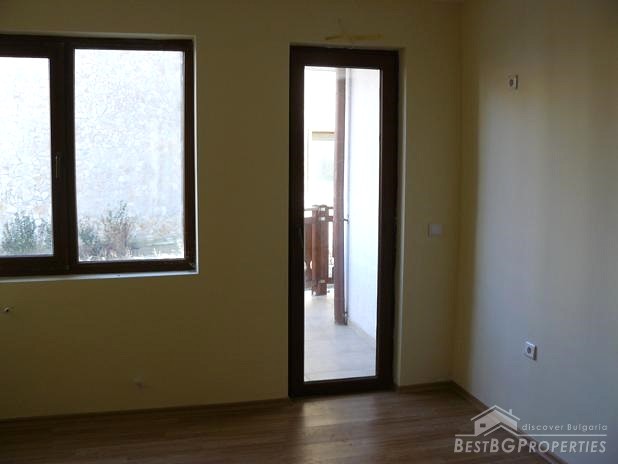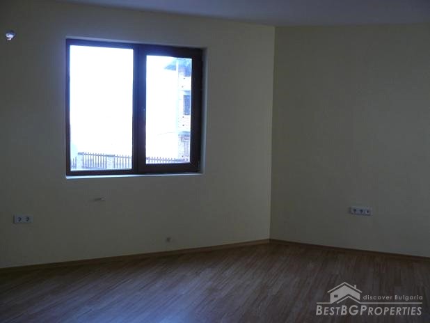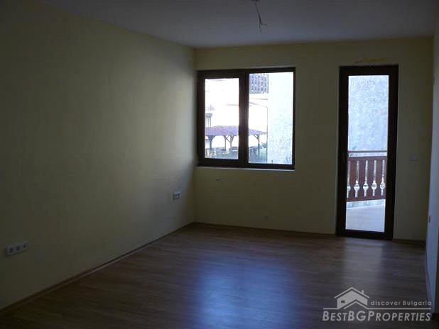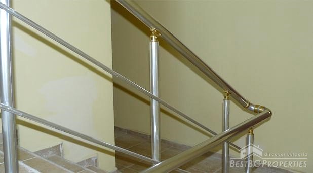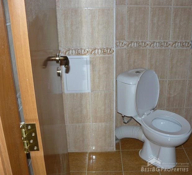 It consists of a dining room (large living room with kitchen), entrance hall, two bedrooms, bathroom with toilet, a separate WC and a large terrace. The terrace is accessed from all three premises. The apartment is facing east and has beautiful views of Pirin and Rila Mountains. The floors are covered with laminate, terracotta in the lounge. The bathroom and toilet are finished with faience and terracotta, equipped with sink, toilet and shower mixer. In the kitchen box there are outlets for a sink, washing machine and a dishwasher. Under the floor there are gas pipes for the central heating, and in the walls – cables for the security system. There is a large basement of 12 sq m. It is finished with terracotta and connected to electricity and water, can be used as a tavern. The total living area of the apartment is 87 sq m.