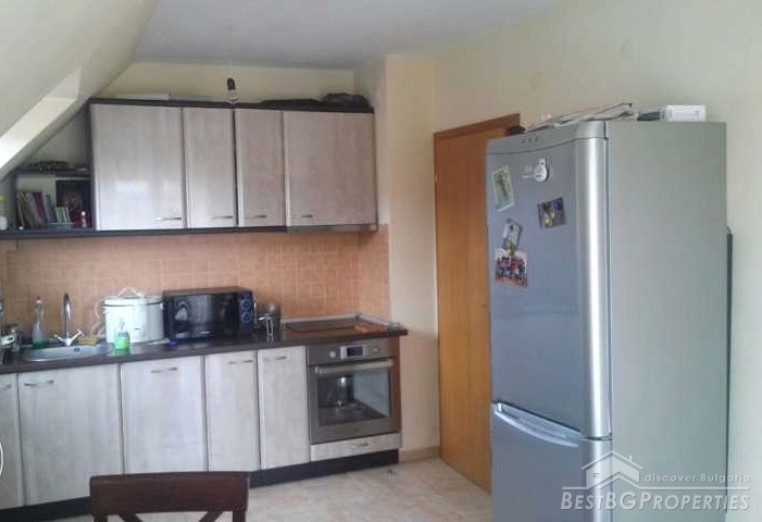 The property has total living area of 80 sq m. It consists of a hallway, two bedrooms, living room with kitchen, bathroom with toilet and two terraces. The apartment is in very good condition. It is completely finished turnkey. Flooring - laminate, walls and ceiling - latex, windows - PVC, interior doors - chipboard, front door - metallic.