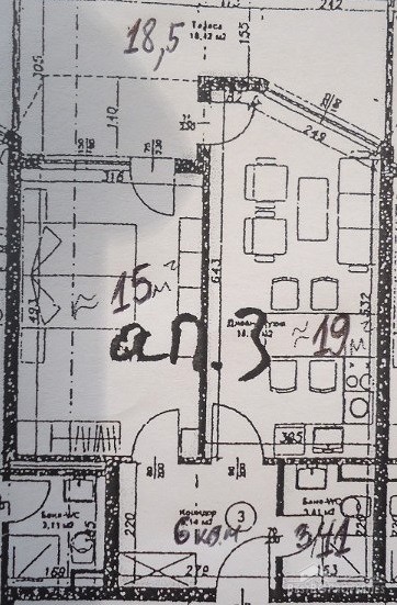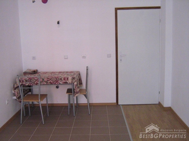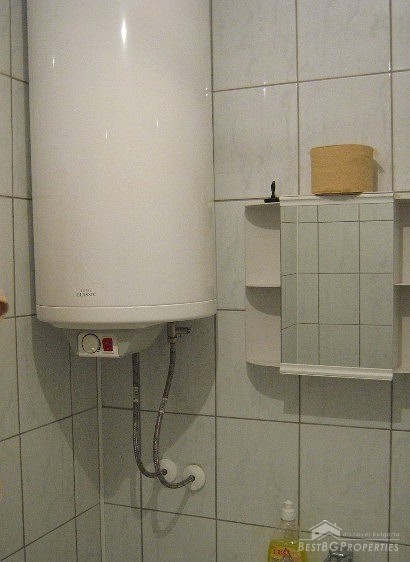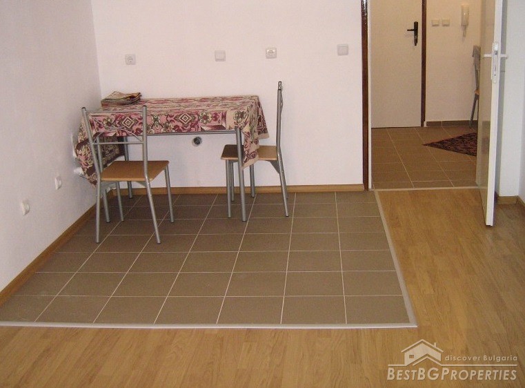 The apartment is finished turnkey. It consists of a living room with kitchen - 19 sq m, with white painted walls, laminate floor, PVC joinery KFM. There is a bedroom - 15 sq m, white painted walls, laminate floors, PVC joinery KFM. The bathroom with WC is 3.5 sq m, finished with faience and terracotta, with water heater, toilet and sink. There is also an entrance hall - 6 sq m with granite floor, and enormous terrace which can be glazed.