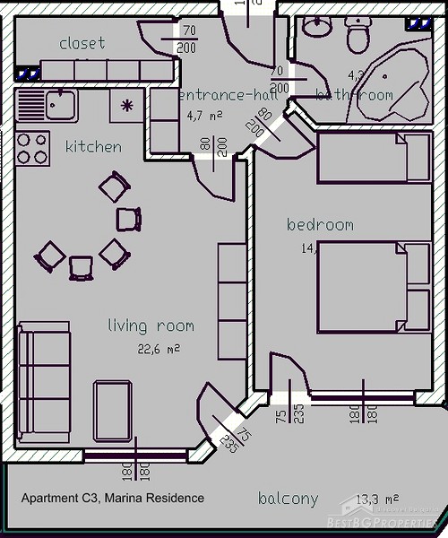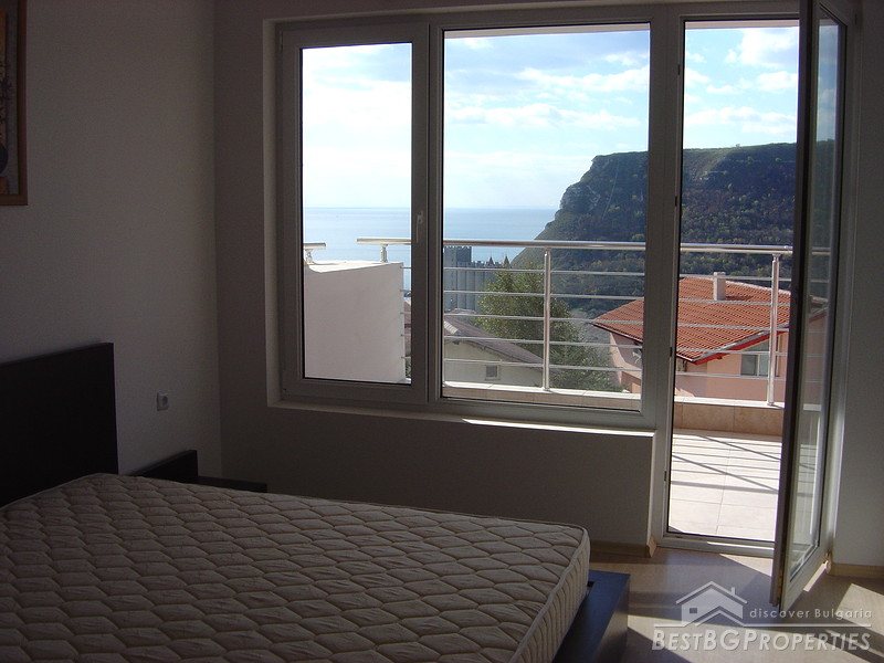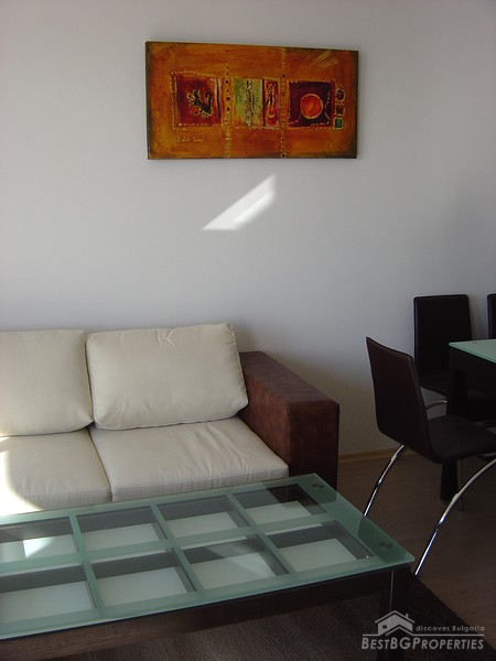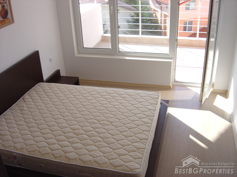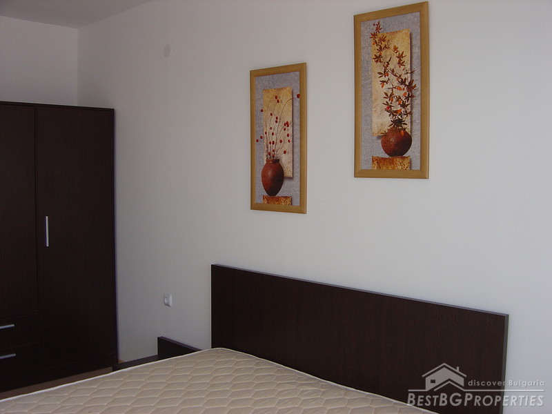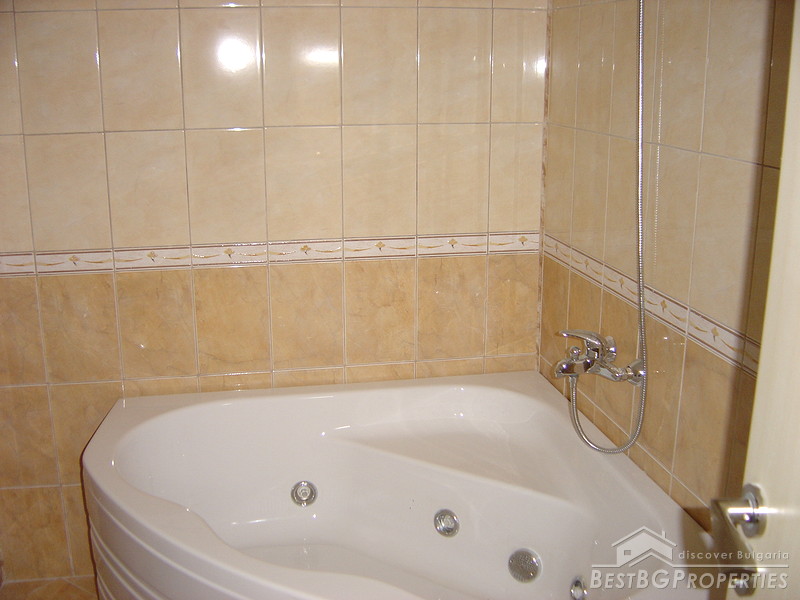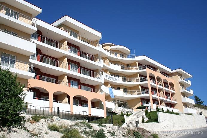 This is an excellent apartment for sale in a luxurious complex located at the new Kavarna Yacht Port and the beach area, 45 minutes drive from Varna and the International Airport and 5 minutes from the nearest golf courses. The complex was finalised in December 2006 and the 32 one bedroom apartments were already rented out for 2 consecutive summer seasons. There is a 24h reception desk on site, security, outdoor swimming pool and parking spaces. The apartment we are offering is located on the 3d floor of the building. It is 1 bedroom type and is 92.43 sq m large. It consists of 1 bedroom, living room, bathroom with WC and terrace. The apartment is finished with high quality materials. The flooring is laminate in the bedroom and the living rooms, terracotta and faience in the bathroom. The walls and ceilings are painted with latex. Electricity and water are provided. All switches plugs and lighting objects are installed. The apartment is fully furnished. The kitchen is equipped with microwave oven, oven, washing machine, fridge, extractor hood, cup boards, iron, ironing board, vacuum cleaner, also all kind of dishes, plates, knifes, glasses etc. The furniture in the living room includes large sofa, 2 stools, coffee table, round dining table, 6 dinning chairs, cupboards, TV table, TV and DVD player. The bedroom consists of double bed with mattress, bedside cupboards, wardrobe with mirror, lamps. The bathroom is equipped with mirror, stand, cupboard, sanitary equipment, bath tub, and sink.