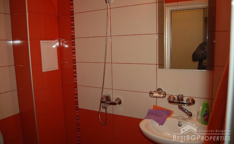The living space is distributed between a kitchen box, bathroom with WC, one bedroom, large terrace. The apartment is finished with sound and thermo isolation, laminate and terracotta floors, latex painted walls and ceilings, PVC windows, etc. It is also fully furnished and equipped with everything necessary.