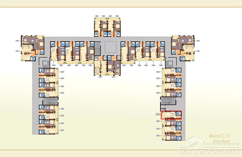 The apartment is located in a newly built complex in Pomorie. The complex is situated along one of the most beautiful beaches of the Bulgarian Black Sea coast, on the very shore of the sea. The holiday village offers apartments from 40 sq. m. to 130 sq. m. Available are 220 apartments- studios and one-bedroom apartments consisting of a sitting room with a kitchenette, a bedroom with a terrace and a bathroom. Most of them have a southern view and overlook the sea. The complex offers a large semi-underground parking place with separate cells. The apartments on sale can be used throughout the whole year. The hotel occupies a central position within the holiday complex and has 37 double rooms and 10 apartments facing the sea with a magnificent view. The café and the cocktail bar are designed in the same gorgeous style, adding an elegant atmosphere to the complex. There are several shops in the complex, well-equipped fitness centre, as well as a unique SPA centre.