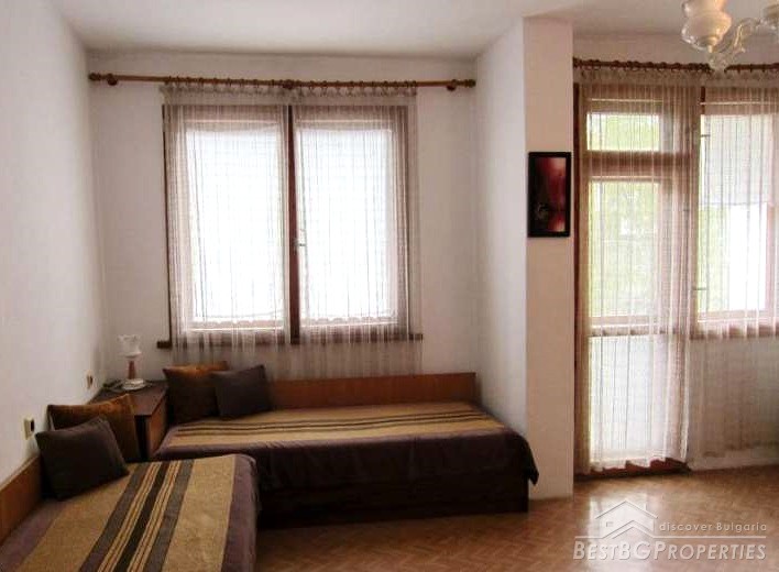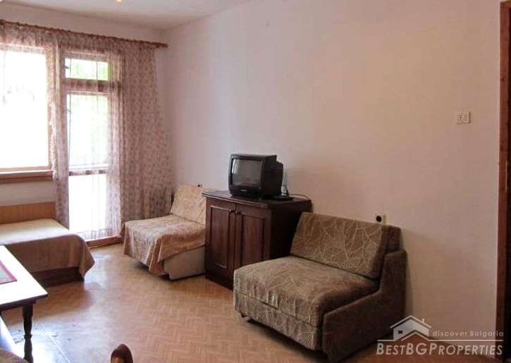 The apartment is situated near the bus station, 500 meters from the beach and close to the "Festa Via Pontica". It consists of an entrance hall, bathroom, two separate rooms, each with private terrace and a storage premise on the ground floor used as a kitchen. The storage room is right under the living room. The walls are plastered and painted. The flooring is linoleum. The bathroom is completely finished with terracotta and faience. The floor in the storage premise is finished with tiles, the walls are painted. The terraces are completed with tiles and mosaic. There are wooden window joineries (double), and the doors are also from solid wood. The apartment is sold with most of the furniture.