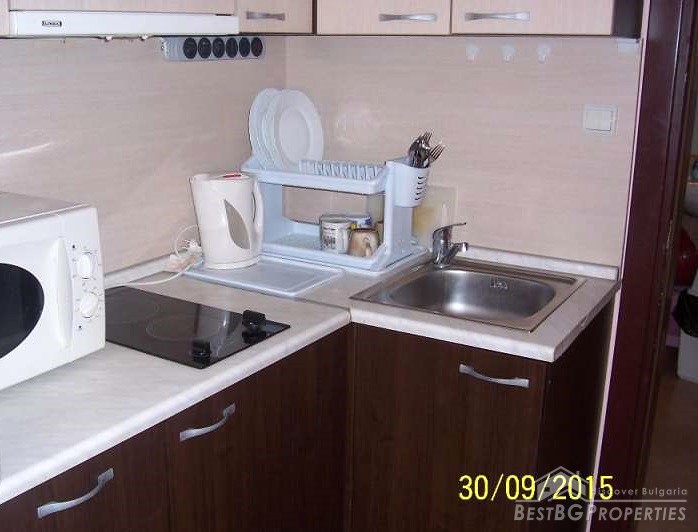 The offered apartment is a studio type. It has total living area of 38 sq m and consists of a living room with sleeping area, kitchen box, bathroom with WC and a cozy balcony. The price includes full furniture and equipment. There are all kitchen appliances, equipped bathroom, sofa-bed and another folding armchair.