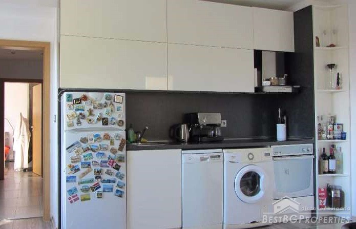 The apartment has total living area of 59 sq m and consists of a living room with kitchen, one bedroom, hallway, bathroom, terrace and a basement. The apartment is fully finished and furnished. The heating is via air conditioning (MitsubishiElectric) and radiators (ADAX). The floors in the living room and the bedroom are completed with high quality laminate.