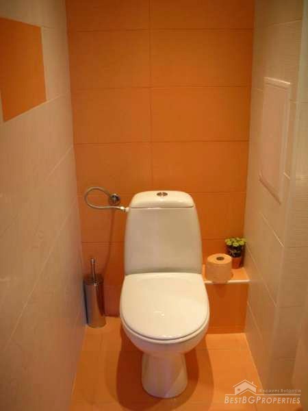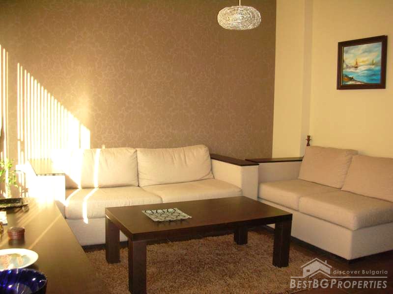 The apartment is two-bedroom, with very functional distribution of the premises and modern furniture. It is set on the third floor out of five and has incredible view over Vitosha. The apartment has total living area of 94 sq m. It consists of a living room with kitchen equipped with high-end appliances, two bedrooms, bathroom, separate toilet, open terrace and winter garden, a cellar and a parking lot.