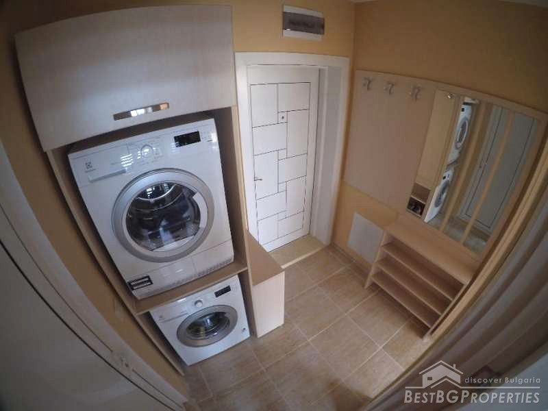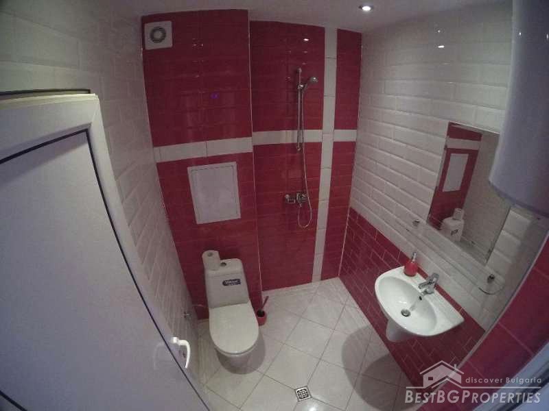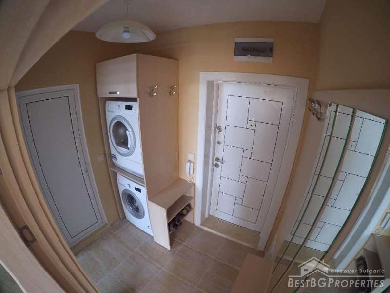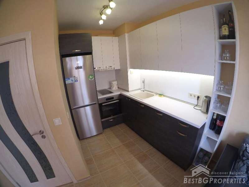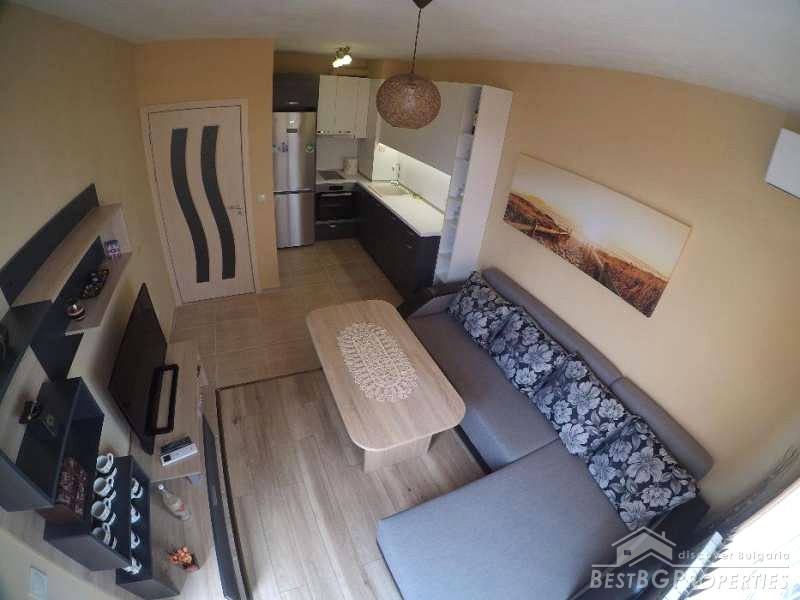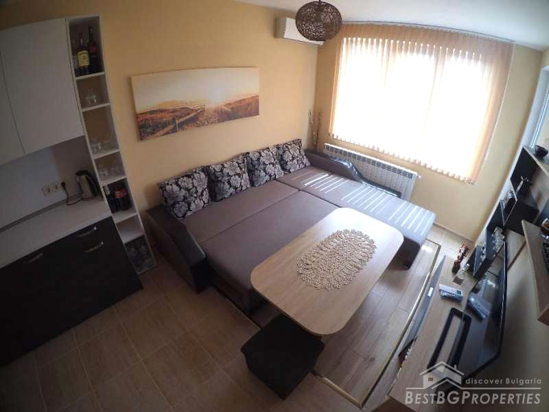 The apartment consists of living room with kitchen box, one bedroom, bathroom and a terrace. The apartment is sold fully furnished and equipped with everything necessary. The finishing is turnkey - granite and laminate floors, latex paint, PVC windows. The furniture is custom made. The electrical appliances are brand new, still in warranty. The apartment was barely used.