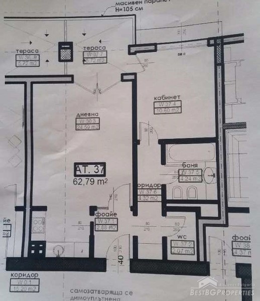 The apartment has total living area of 77 and the following distribution: entrance hall, living room with kitchen box, one bedroom, bathroom, laundry room and a terrace. The layout is very functional and convenient to use.