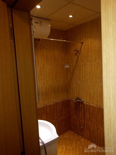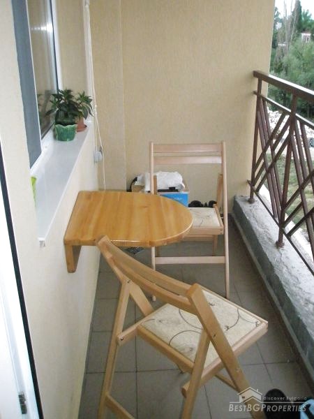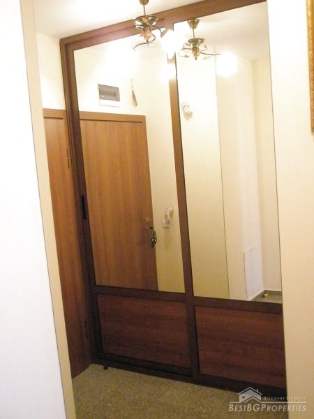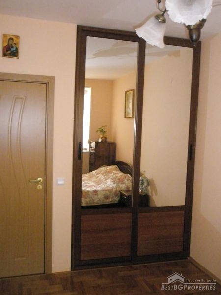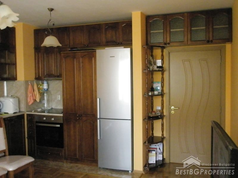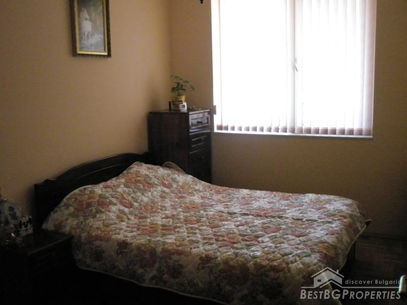 The apartment occupies the fifth floor out of ten in the building. It has a clean living space of 60 sq m. The apartment is facing south. It is sold finished, with very good quality of the finishing works – latex paint, wooden parquet, PVC window joinery, equipped bathroom and toilet and so on. The apartment is spacious and bright.