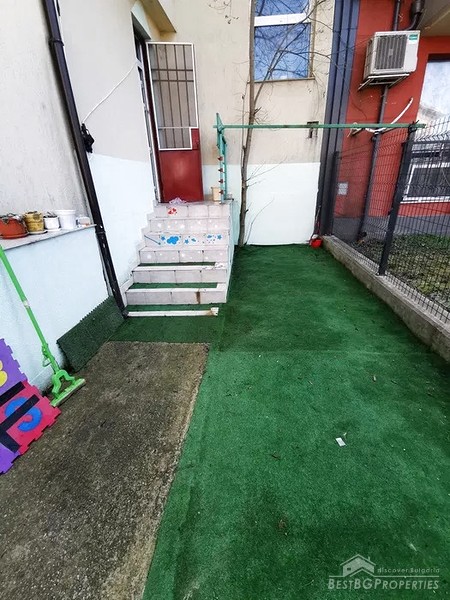 The apartment consists of 1 large living room-dining room, separated by a bar-counter kitchen with exit to the yard, a separate room that can be used for an additional bedroom, study, large closet which also has an exit to the yard, master bedroom and a bathroom.