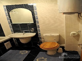 The apartment is one bedroom type. It has total living area of 91 sq m. The apartment is situated on the first floor of the building. The building is facing a cross road in front of a BILLA hypermarket. The living area is distributed between a living room with kitchen box, bedroom, bathroom with WC, corridor and a balcony. The apartment has east exposure. The building is newly built. It comprises ground and underground garages for additional cost. The apartment is finished "on key" stage, furnished kitchen and equipped bathroom - sanitary equipment and bath tub. The apartment is finished with latex painted walls and ceilings, laminate floorings, the bathroom is finished with terracotta and faience. There is a basement included in the price.