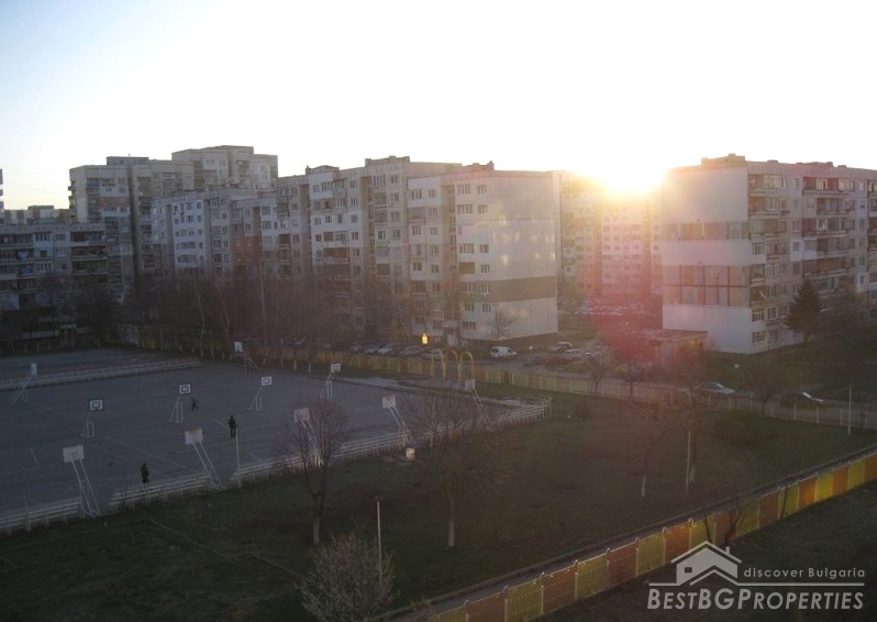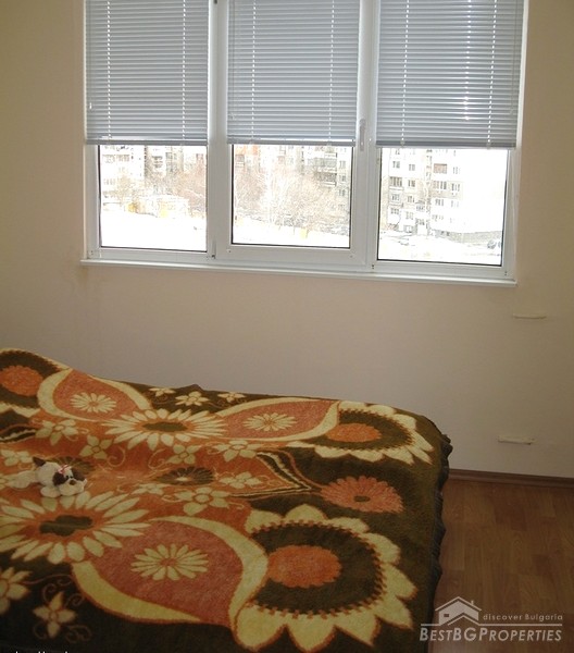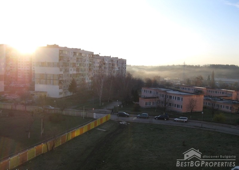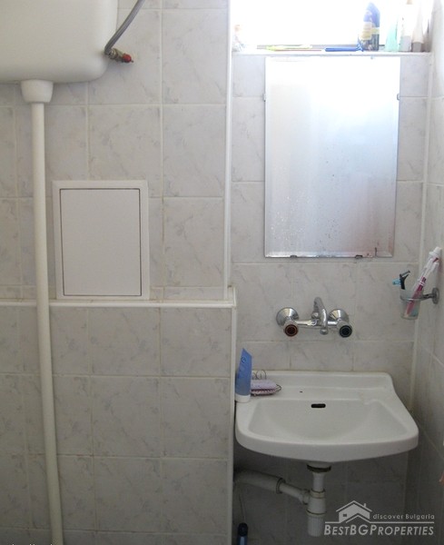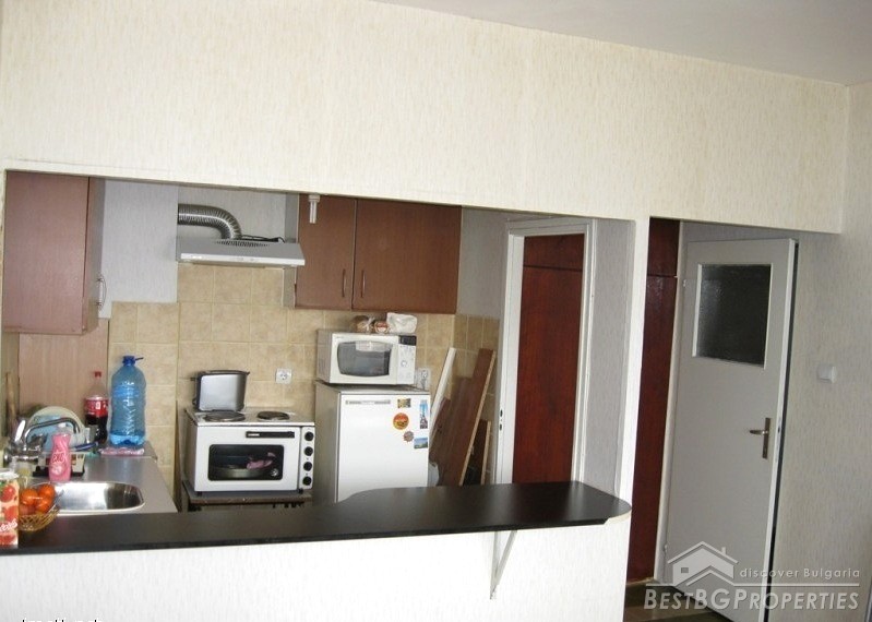 The apartment is one bedroom type with total living area of 45 sq m. The living area is distributed between a bedroom, living room with kitchen box, small balcony with nice views towards the park and the playground. There is also a bathroom with WC. The apartment has east exposure and it is very bright. It is for sale in very good condition. On of the rooms is recently renovated, finished with PVC window joinery, latex painted walls and ceilings, laminated floorings. There is inner isolation, water and electricity, all switches and sockets are installed. The bathroom is finished with terracotta and faience. The apartment is for sale completely furnished. The kitchen is fully equipped with all electrical appliances. The bathroom and WC is also fully equipped with everything necessary.