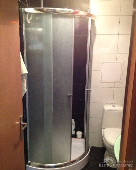 The finishing is turnkey – terracotta and laminate floors, plasterboard with Venetian putty on the walls, wallpaper bedroom. The building is U-shaped, and the apartment is internal. It is located in the Student’s town, near Fantastico. In the building there are grocery stores, cafe, and a beauty salon. In front there is a separate playground.