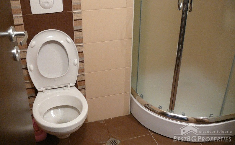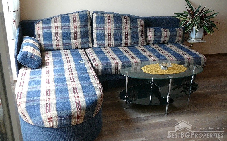 The apartment has clean living area of 55.38 sq m and 15 84 sq m common parts. It consists of a living room with kitchen, bedroom and a bathroom. There is a sunny balcony with mountain view and exit from both rooms. The monthly maintenance fee is 47 lev.