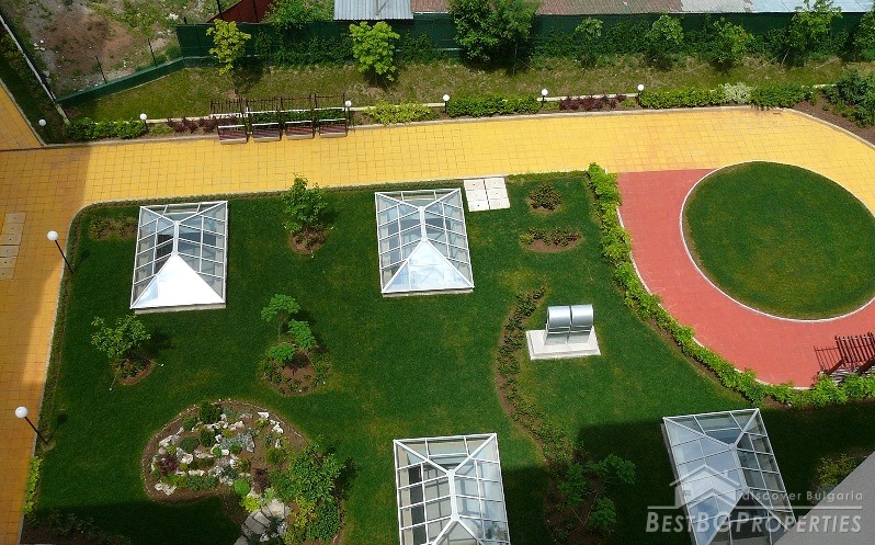 The complex has 2 underground floors and there is possibility to buy or rent a garage or parking space. It has a fenced yard, 24-hour security, daily cleaning of common areas.
