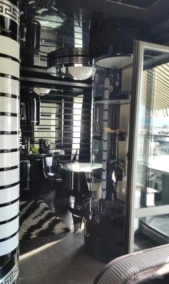 It consists of a living room with soft furniture and equipped kitchen - 36.48 sq m; terrace - 8.52 sq m to the living room; corridor - 8.26 sq m; spacious master bedroom - 18.20 sq m with stylish round bed and wardrobe; bedroom - 15.62 sq m with a double bed and wardrobe; second terrace - 3.15 sq m to the small bedroom; bathroom - 4.42 sq m with hydromassage shower and luxurious tiles; laundry room - 1.75 sq m with a washing machine; wardrobe - 1.75 sq m. The living room and master bedroom are facing east and smaller bedroom faces west.