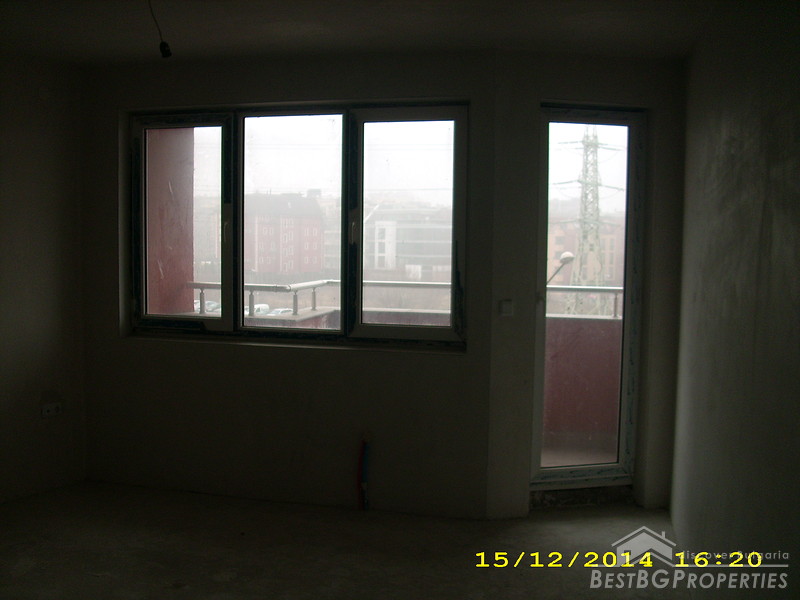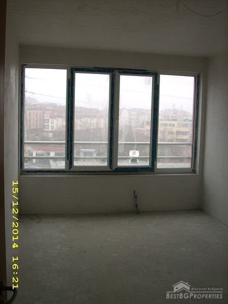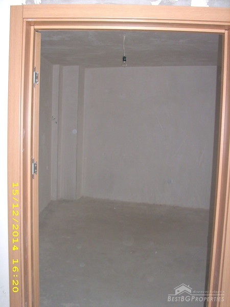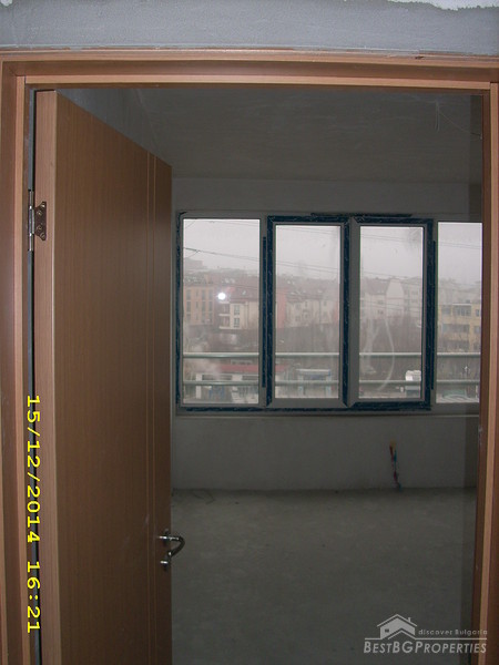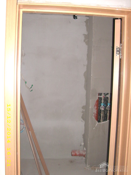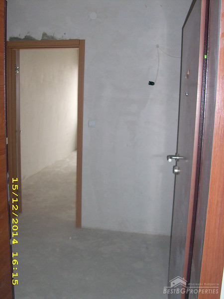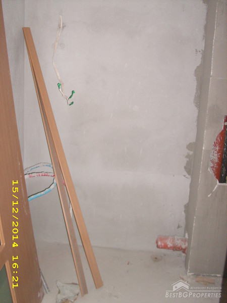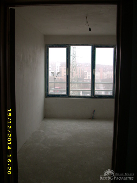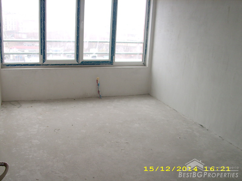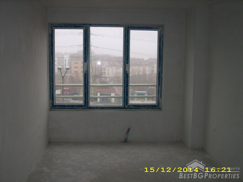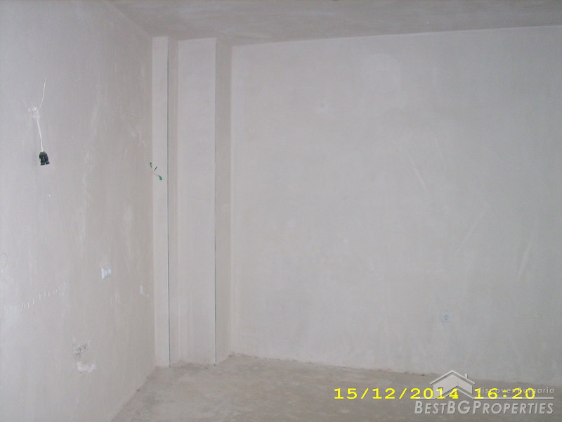 The apartment is two-bedroom type and consists of 3 rooms with a premise for a bathroom with WC and corridor. It is equipped with 4-chamber PVC windows with thick exterior glass. The apartment is completed according the Bulgarian standard – on plastering and putty and needs final finishing.