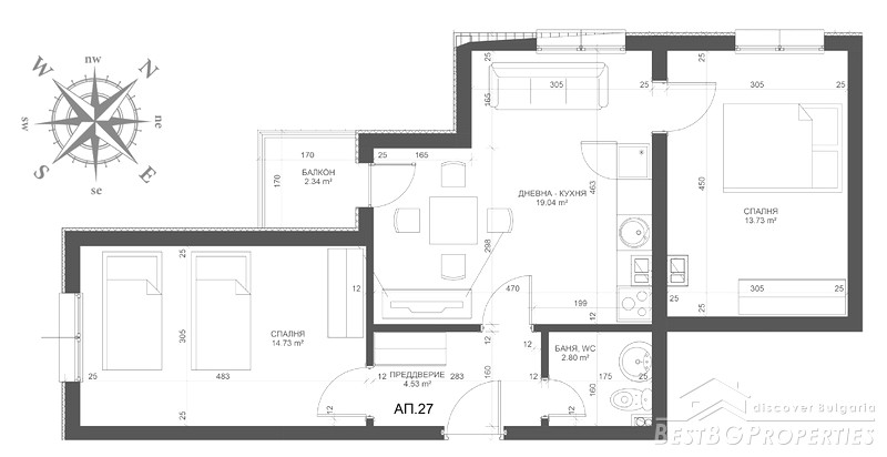 The apartment consists of a living room with kitchen box (19.04 sq m), bedroom (14.73 sq m), second bedroom (13.73 sq m), balcony from the living room (2.34 sq m), bathroom with toilet (2.8 sq m) and a lounge (4.53 sq m).