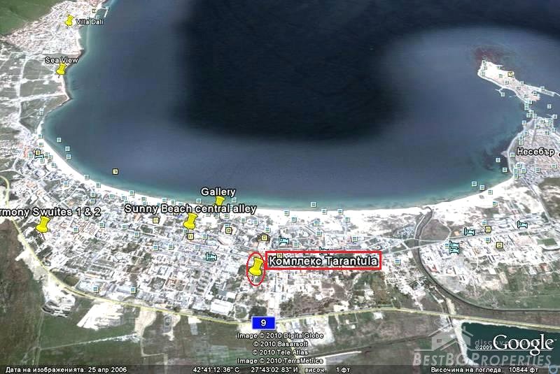 The complex is located in an area with a perfectly built infrastructure: there is an asphalt-paved road, running along the complex, some 20 meters away from it there is a super-market, a pharmacy can be found at a 50 meter distance and the central bus-station of Sunny Beach is 200 meters away. It is in the immediate vicinity of Sunny Beach Resort's center, about 7-8 minutes walk from the sea and 100 meters from the inner road.