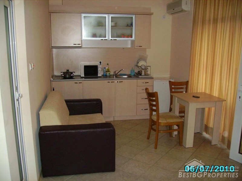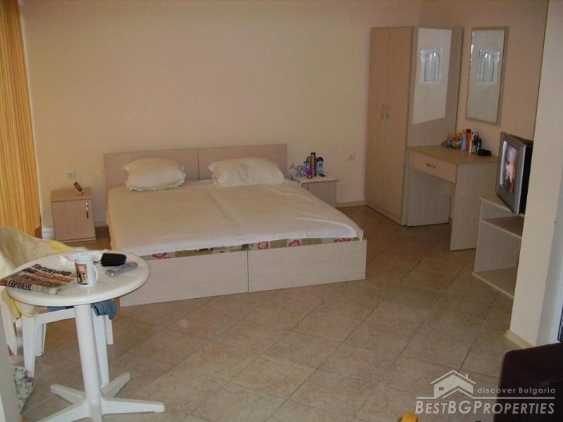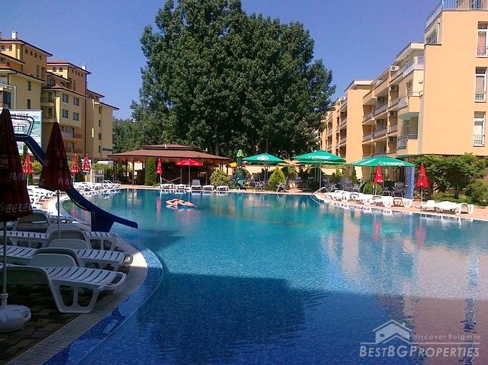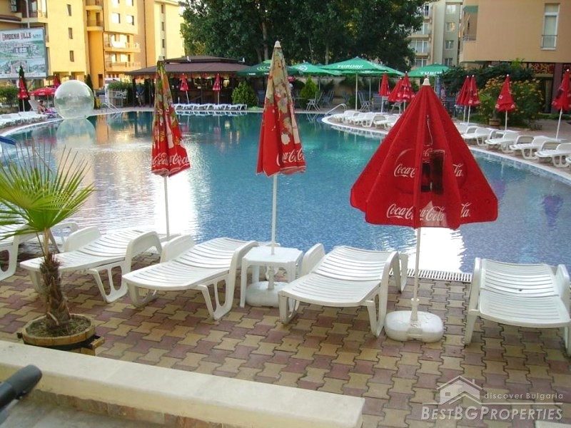 The property is located in the central part of the resort close to the disco club "Grand" (Multiplays), south from the bus station and about 300 meters from the central beach. The complex has 2 pools, bar, restaurant, green areas, maintained and guarded year round. The infrastructure in and around the complex is fully developed and working. Just 100 meters behind it there is the cheapest in the resort supermarket “Mladost". The complex was put into operation and has act 16 since 2007.