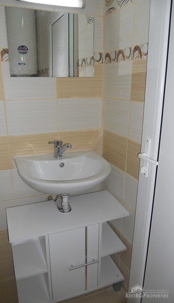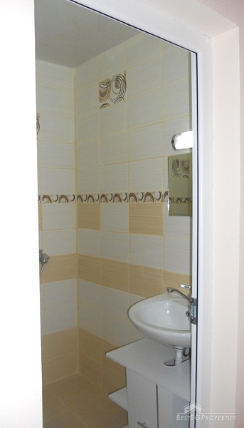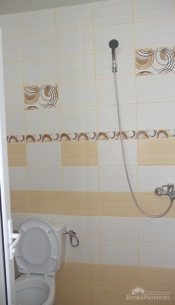 The apartment is one-bedroom type, new construction, finished in 2010 year. It is offered "on key" with laminate floorings and floor isolation, equipped kitchen with kitchen cabinets and extractor, furnished and equipped bathroom with WC, blinds. The total living area of this apartment is 50 sq m. It is situated on the third floor out of four. The living area is distributed between two rooms, bathroom with toilet and a balcony. It is facing west and is very sunny and warm. The price also includes a basement - 12 sq m. The property is situated in the ideal center of the town. There is an option to purchase a garage in the same building - 12 sq m.