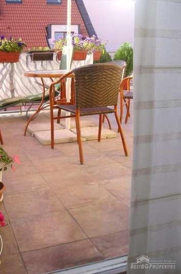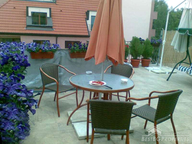 The apartment consists of two rooms (living room with kitchen, one bedroom and bathroom). It also benefits with a large south facing lovely terrace with area 30 sq m. The apartment is set on the last, fifth floor in a residential building of new construction. It is fully equipped (including electrical appliances). The total living area of the apartment itself is 90 sq m.