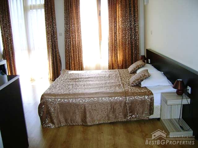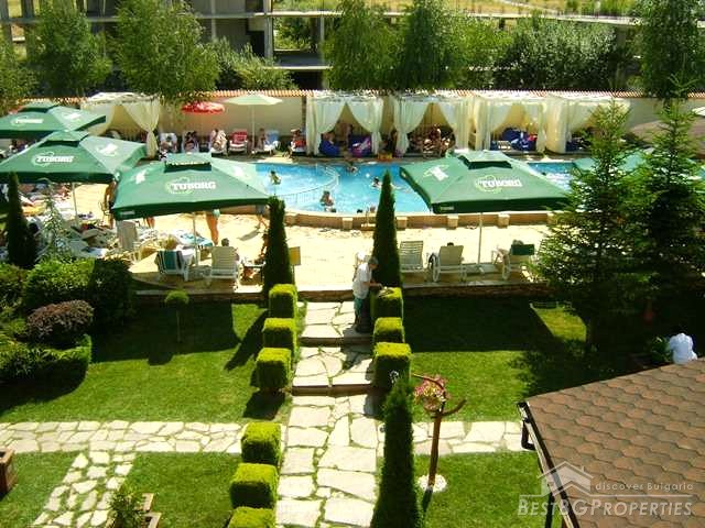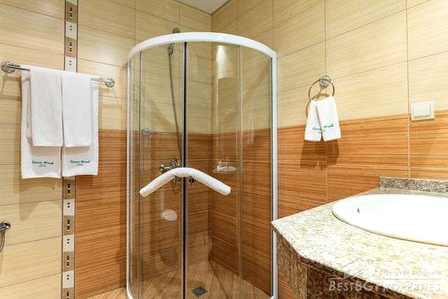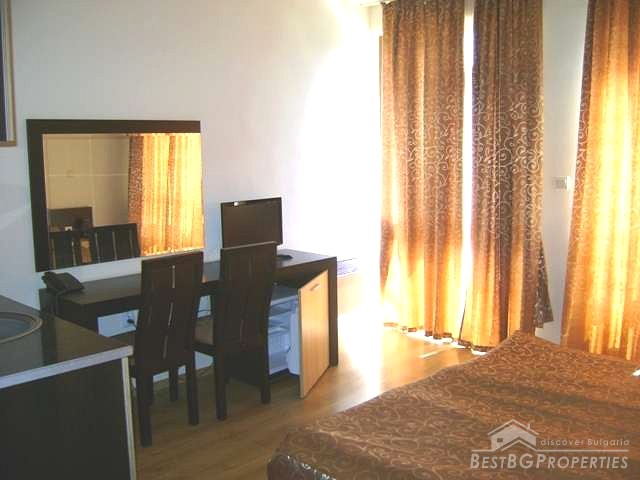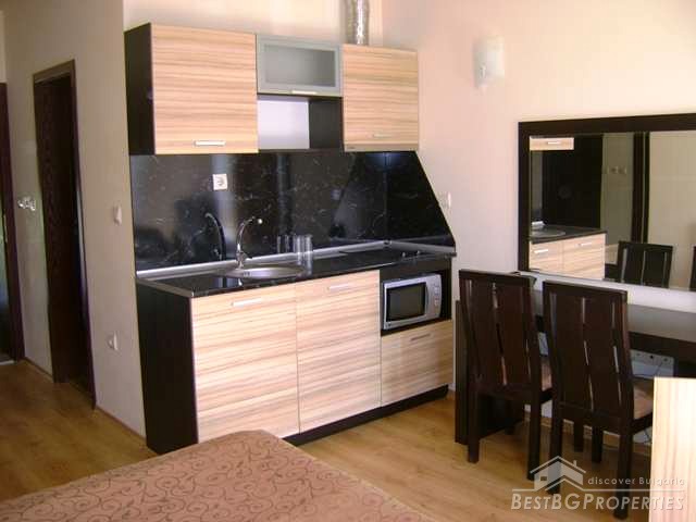 The studio has a fully equipped kitchenette with two hotplates, a hood, a fridge and a microwave. It is also furnished with a double bed, bedside tables with lamps, a wardrobe and a dressing table with a mirror. The bathroom is beautifully finished and equipped with a sink, a toilet and a shower cabin. The spacious balcony provides fantastic panoramic views of the Pirin Mountains and the beautifully landscaped courtyard of the complex.