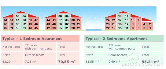 The complex consists of 64 apartments: 24 two-bedroom apartments and 40 one-bedroom apartments. Each apartment has the same floor plan!