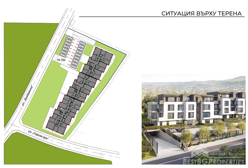 We offer you apartments located in a gated complex in Dragalevtsi quarter at the foot of Vitosha Mountain. Built on a plot of 3928 m2, the complex offers 2750 m2 of parkland, children's playgrounds, gazebo and more.