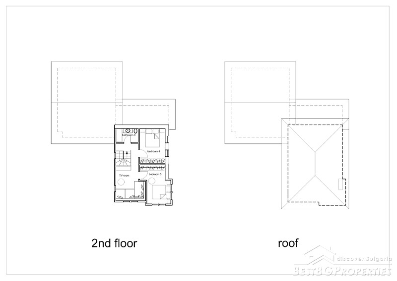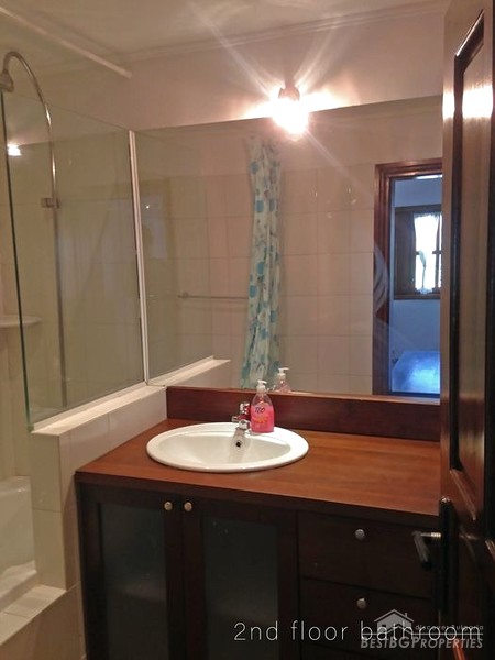 A staircase leads to the second level where there are three bedrooms (2 doubles, 1 single) with two bathrooms with a toilet. The western bedroom has its own bathroom with a toilet, a closet and a terrace.