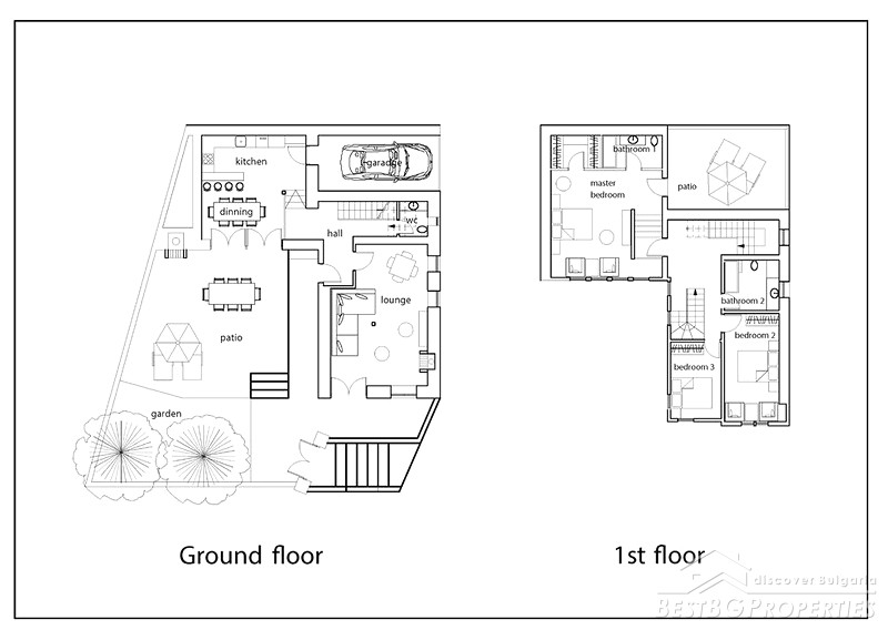 On the first level there is a large lounge with a fireplace, a toilet, a dining room and a fully equipped kitchen with access to the garage and the yard. The garage is housing a newly installed high-class pellet heating system.
