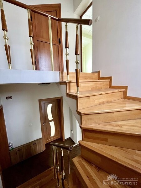 The size of the yard is 547 sq m. It is landscaped, well-maintained, with a separate barbecue area in a separate building. The total living area of the house itself is 180 sq m. The living space is functionally distributed on three levels.