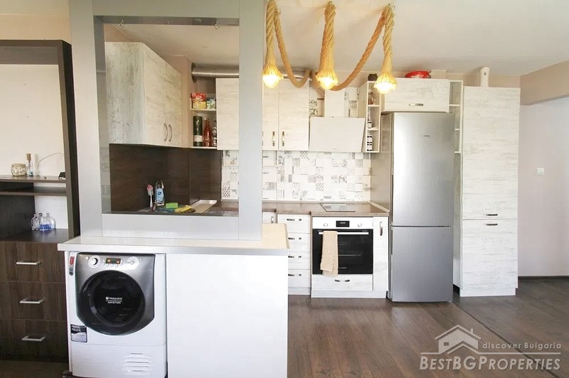 The building is located in the eastern part of Bansko, on a quiet street. The apartment is on its third floor. For sale fully furnished and equipped. The living room is fitted with a large sofa with a coffee table. There is also a fully equipped kitchen with hot plates and an oven and a refrigerator. There is a washing machine and a dryer. All the appliances are brand new. The master bedroom is furnished with a large double bed and a three-door wardrobe. The bedroom has access to a small southern balcony overlooking the Pirin Mountains. The other bedroom is furnished as a children's room.