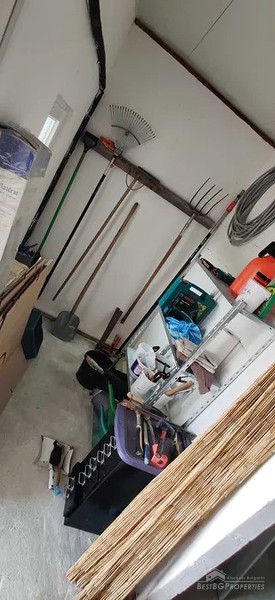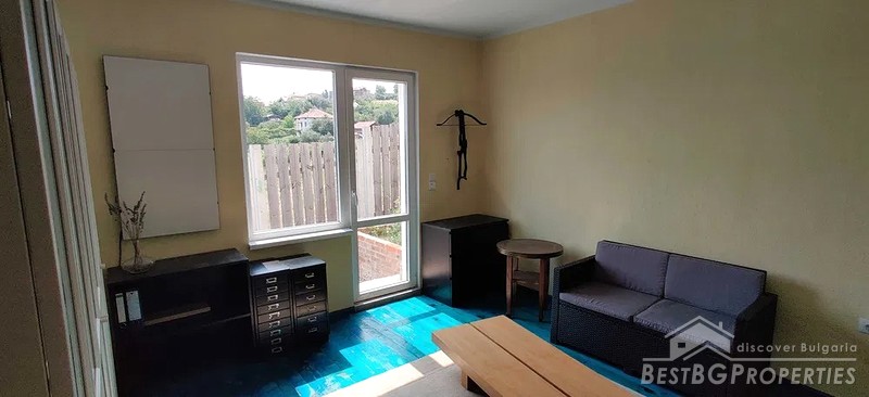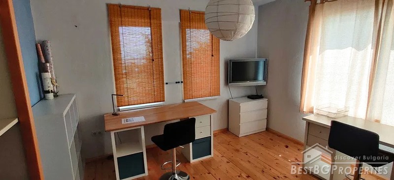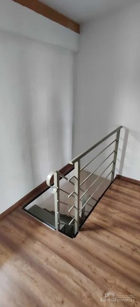 The house has a kitchen (new), fitted with kitchen island. The kitchen is equipped with induction hobs and fridge freezer. There is also a living room and a bathroom. Upstairs there is are two rooms, one of which with a wardrobe and a safe. The other room that was used as an office. There is also a bathroom with a bathtub. The house has a large, south-facing balcony of 16 sq m. On the upper floor the floors are laminate, on the lower floor - tiles or new wooden boards.