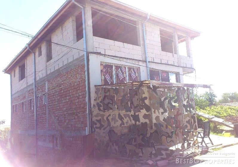 The house has three floors. It is only partially finished and needs some work. The year of construction is 2006. The built area is 450 sq m and the yard is also 450 sq m. On the first floor there are three bedrooms, large living room with kitchen, two bathrooms and a storage room. The second floor comprises of a working shop with area 50 square meters, and additional 100 sq m of space meant for a restaurant. The third floor is also residential but not finished. It could be separated in to two apartments each with size 60 sq m with own bathrooms and WCs and a shared balcony.