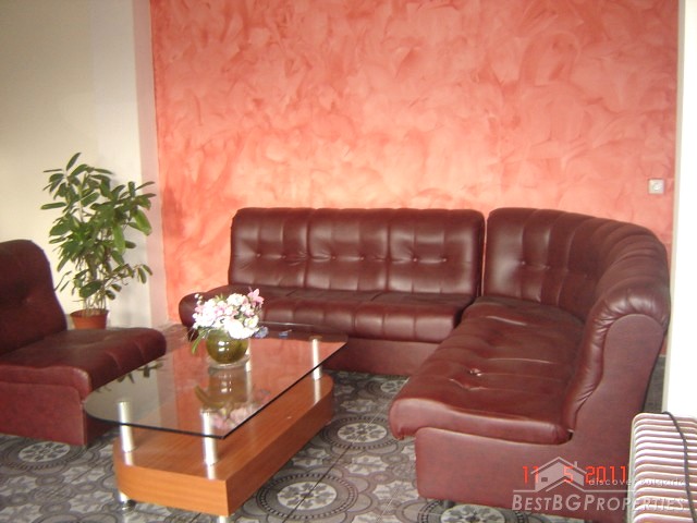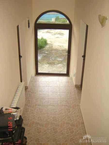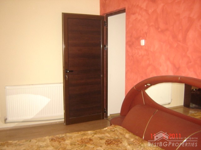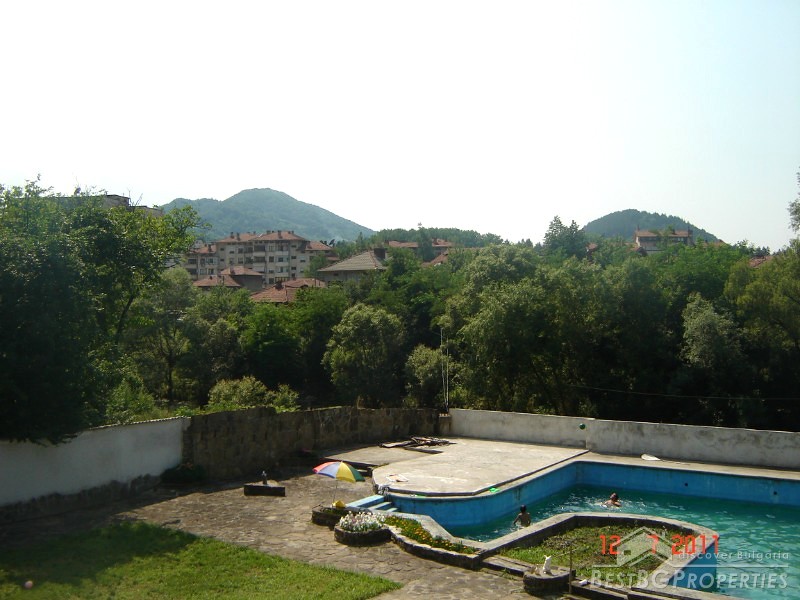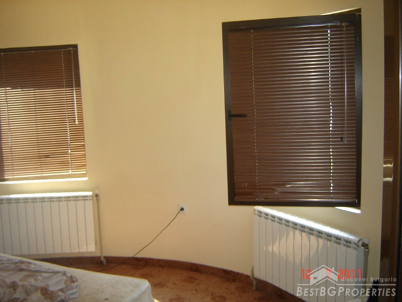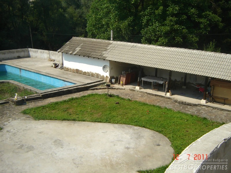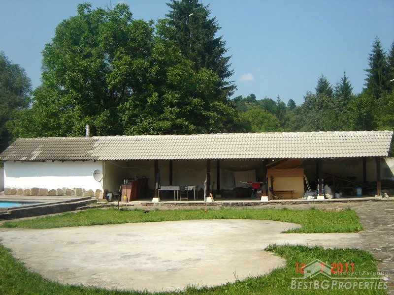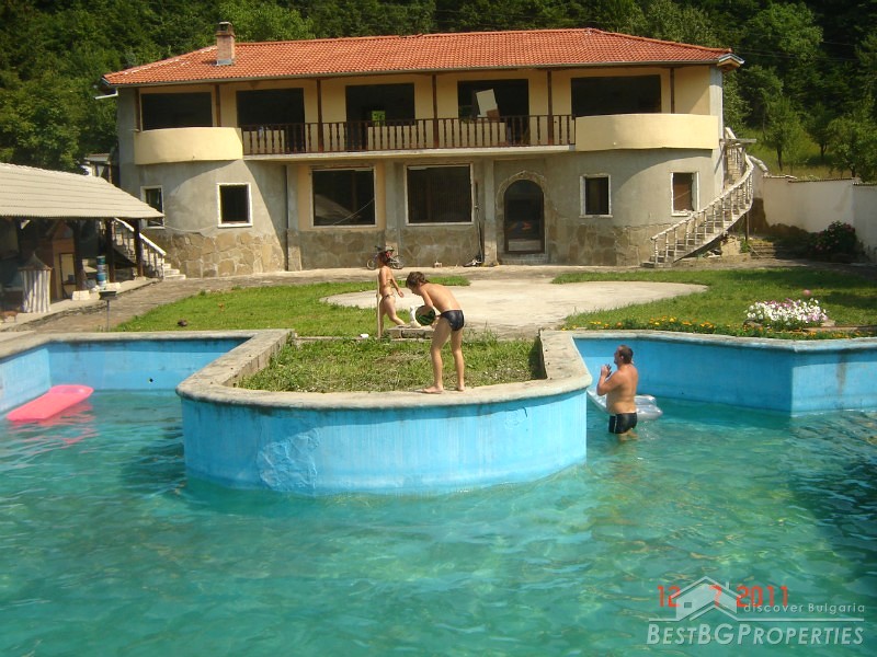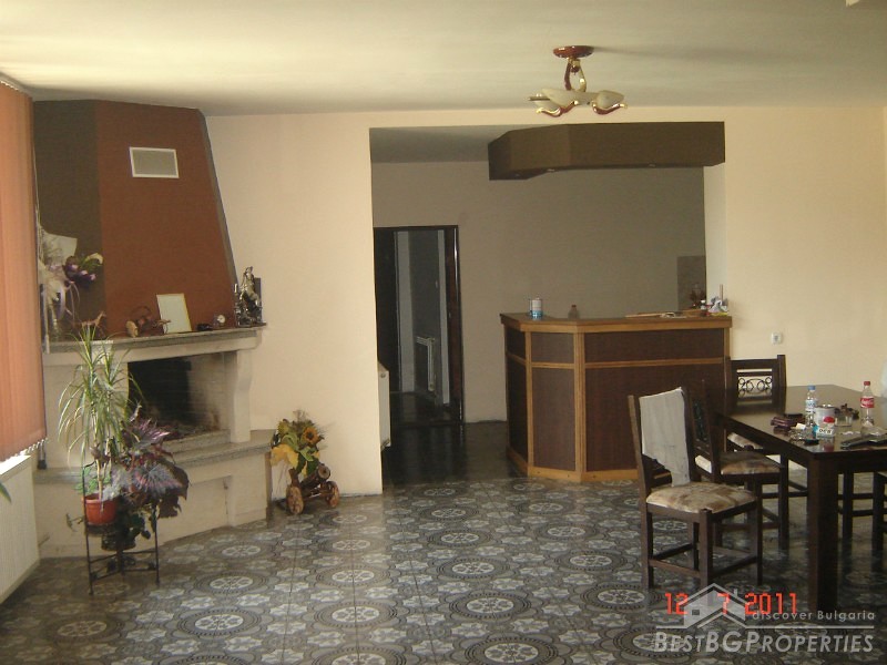 The property faces an asphalted road and a river and it is close to many different shops, a school and a kindergarten. The distribution of the premises inside is as follows: on the first floor there is a living room with fireplace and kitchen box, dining room, three bedrooms and a bathroom. On the second floor there are six rooms with bathrooms. The second floor has electrical installations but there are no window joineries, floorings, or painting. The house benefits with local heating via boiler on solid fuel and in the living room on the first floor there is an air conditioner. There is external insulation. The garden area is 1000 sq m. It is flat and surrounded by a solid fence. In the yard there is a large pool – 280 sq m and a shed for parking 5 cars. The property is supplied with electricity, water and sewer. It is suitable for a small family hotel.