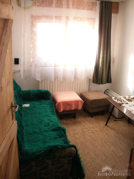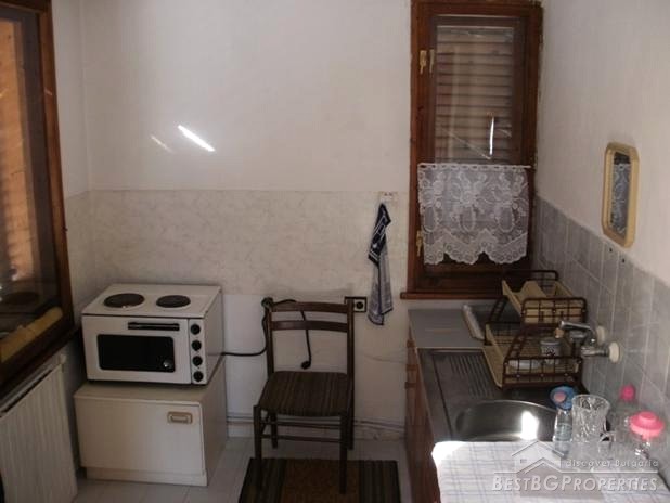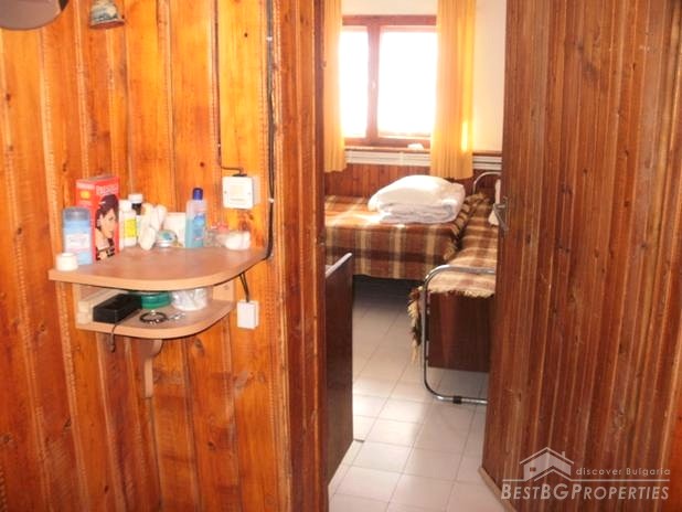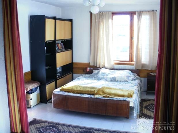 The disposition of the premises in the house is as fallows: On the 1st floor there are 3 rooms - one has a fireplace and one has a wood-stove and a kitchenette, a small closet, bathroom. The entire floor is fitted with cladding. The floorings throughout the house are tiled. On the 2nd floor there are 2 rooms, one with kitchenette, also there is another bathroom with WC. There is a terrace with area of 36 sq m under which, are the two garages. The terrace is glazed and there is a fireplace with a water jacket.