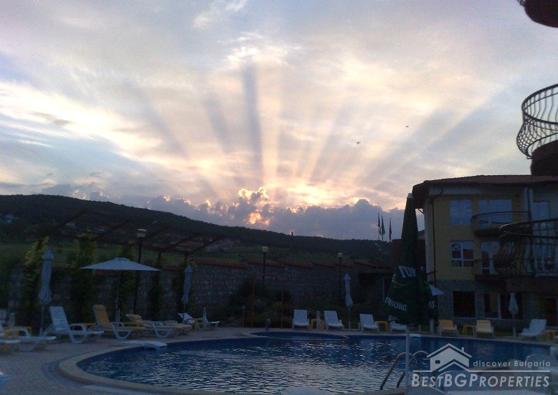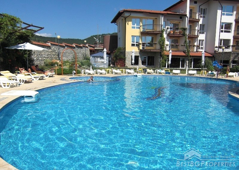 The house has area of 80 sq m and a yard with size 250 sq m. The price also includes two parking spaces. The complex has its own water supply from 1350 m depth which provides mineral water to every house. It also has a swimming pool, sauna, restaurant and piano bar. Under construction is a 750 square meters spa center. The complex has 24/7 security and controlled access at the entrance. The property is only 3 km from the sea.
