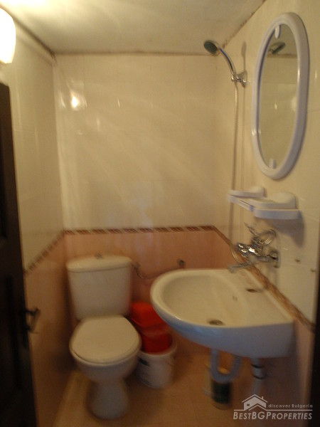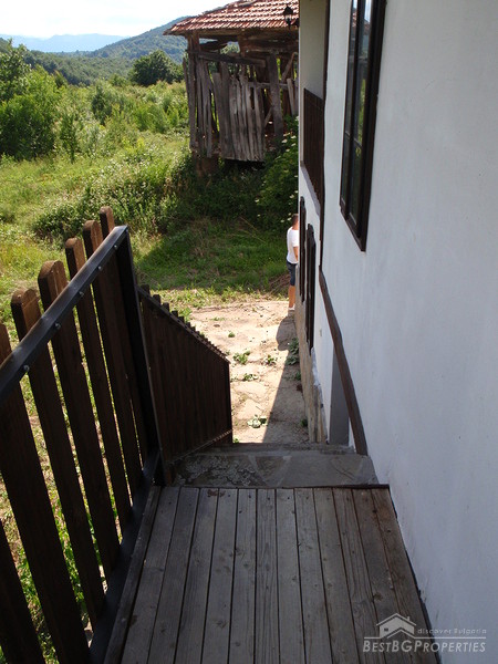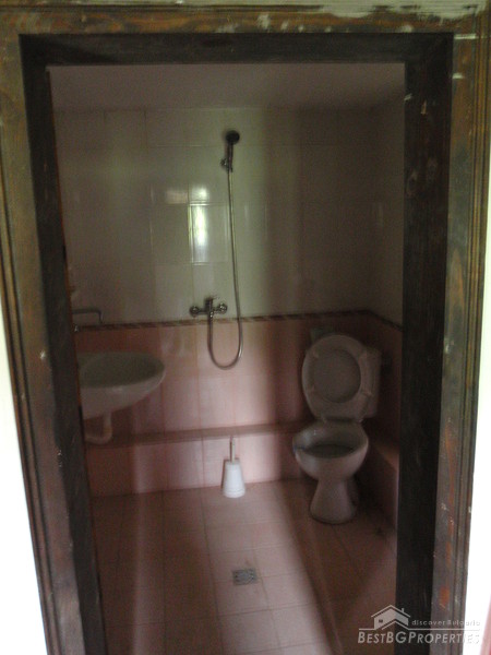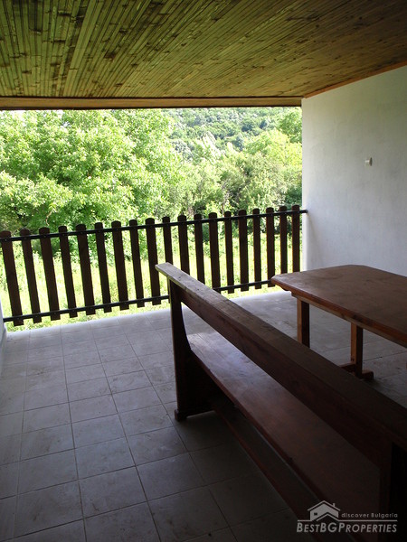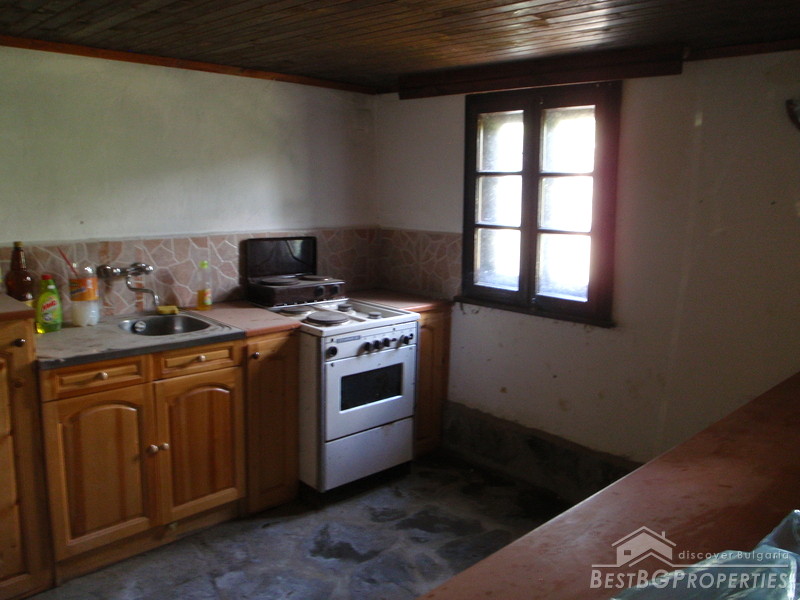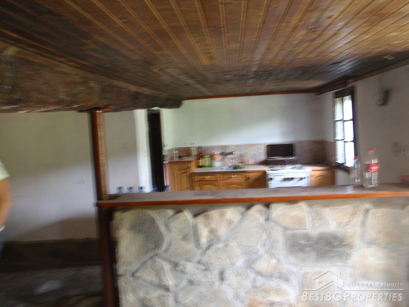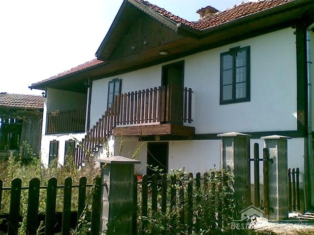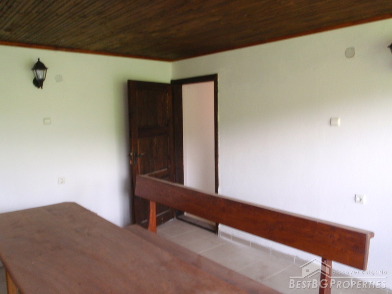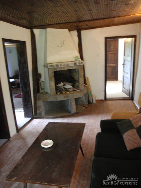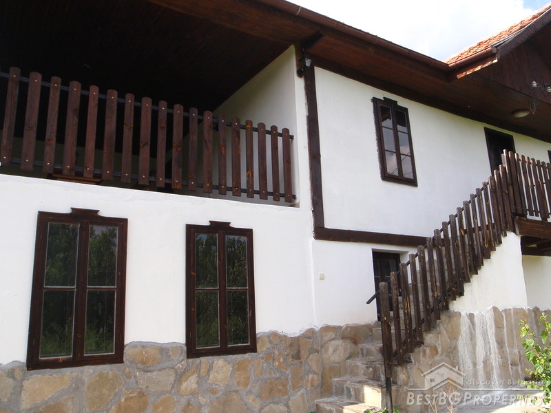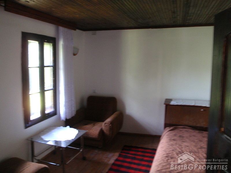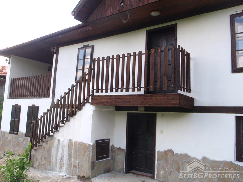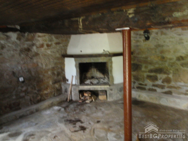 The distribution of the premises is as fallows: On the first floor there is a tavern with fireplace, one bedroom, and bathroom with WC. The floorings are with tiles and terracotta. External staircase leads to the second floor, where you will find a lounge, 2 bedrooms, living room with fireplace, large covered porch, and a bathroom with WC. The floorings are wooden, ceiling paneling, furnished in old style. The plot area is 2100 sq m, pavement with four parking spaces. Electricity, water, asphalted road and all communications are available.