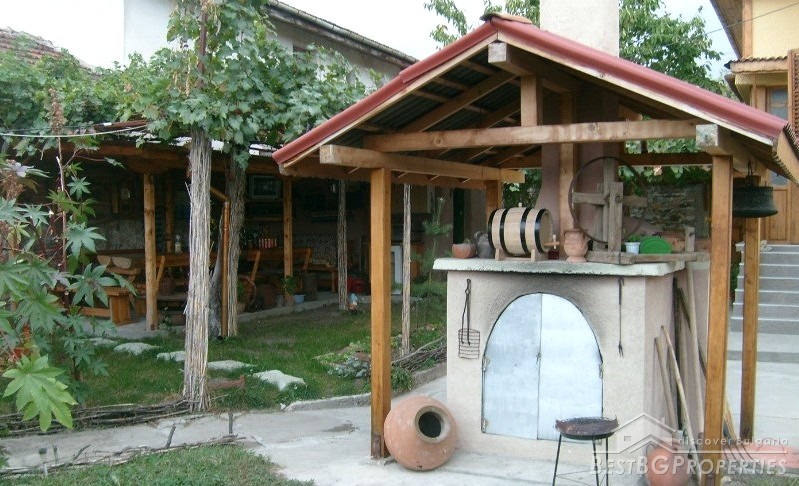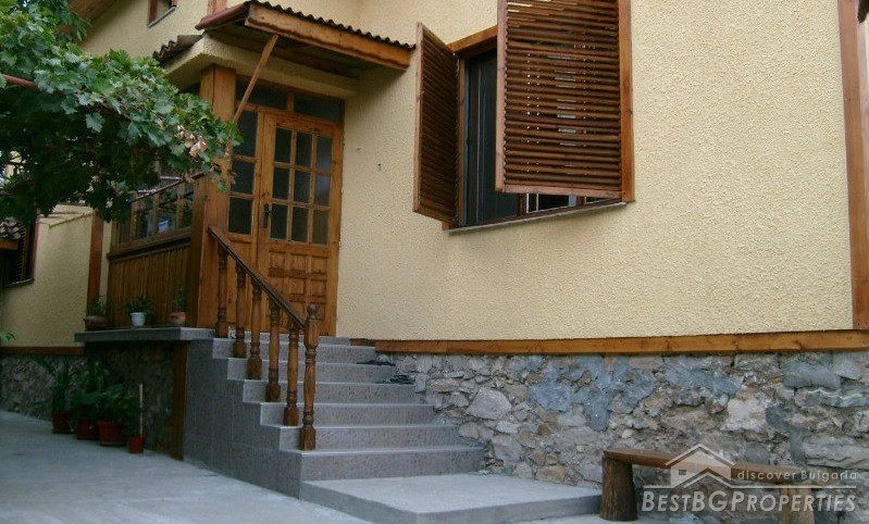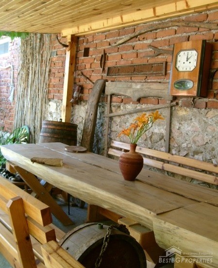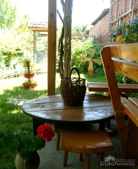 The house is in the traditional style. It was fully repaired 1 year ago. It has drainage, central heating, solar collector, inside and external insulation. The house consists of two bedrooms, living room, kitchen and bathroom with large bathtub and a toilet. It is fully furnished and has air conditioners in two of the rooms. The house has unique interior design with ethnic elements. On the attic there is a small gym. The price of the house includes the furniture.