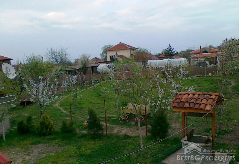 The property is situated in proximity to a main road and next to the new highway "Maritsa". It comes with a spacious plot of land with size 1000 sq m. In the yard there is an orchard, vines, a well, gazebo, barn, outdoor fireplace with barbecue and two garages.