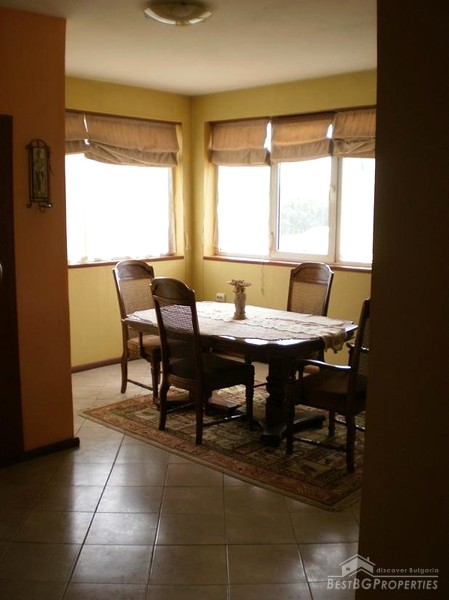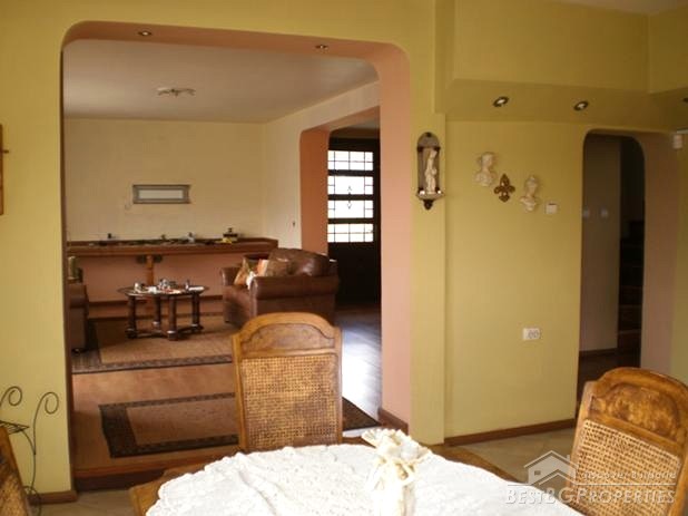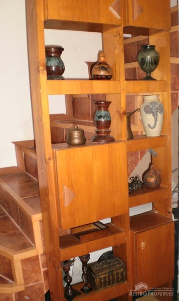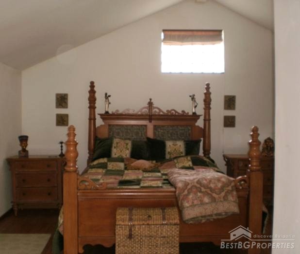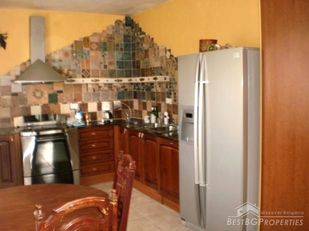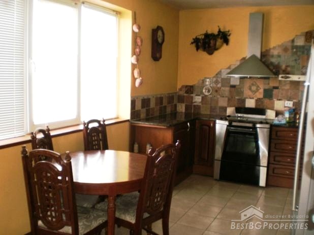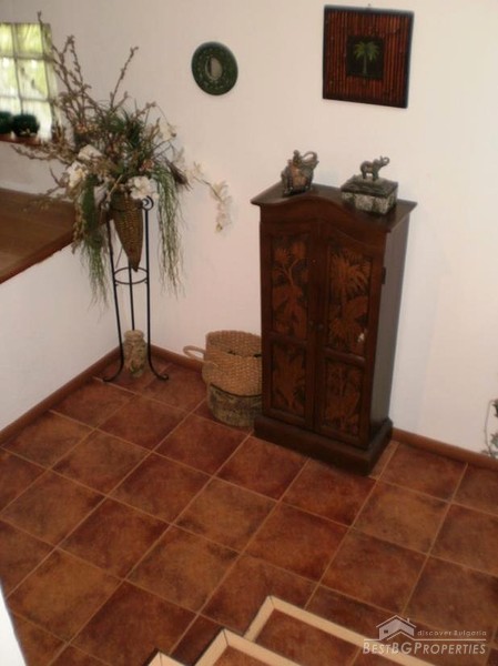 The house is located 1 km from Nova zagora, on the way to the town of Yambol, 1.5 km from the Trakiya highway. It consists of two stories and full size basement with garage. First floor comprises an open plan- kitchen, dining room and living room, two entrances, bedroom and a bathroom. All this has an area of 100 sq m. The second floor consists of a master bedroom with large walking closet, bathroom and an office with access to a 40 sq m veranda.