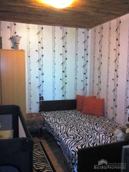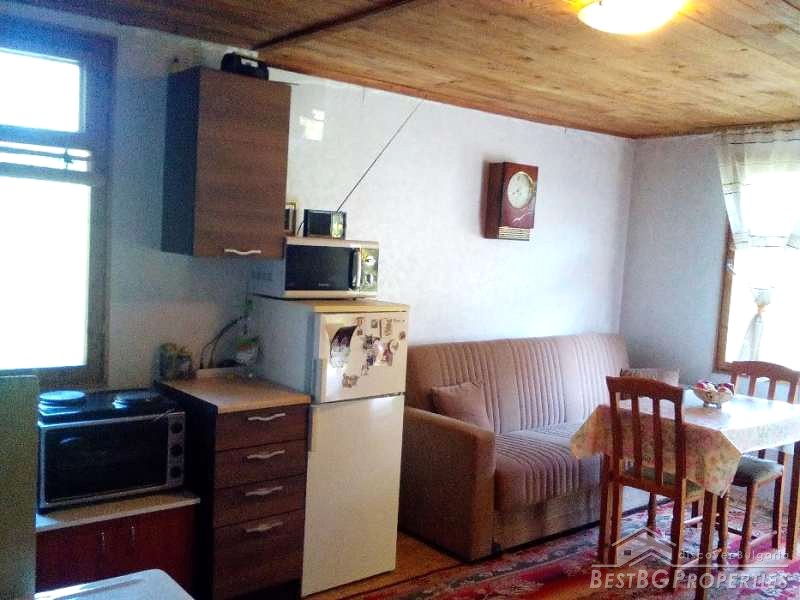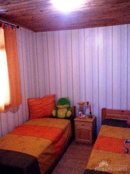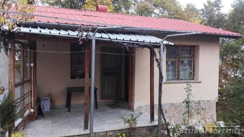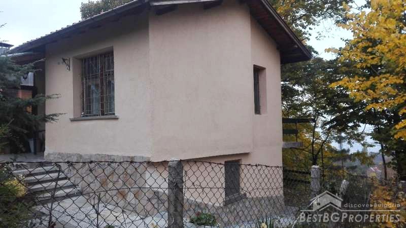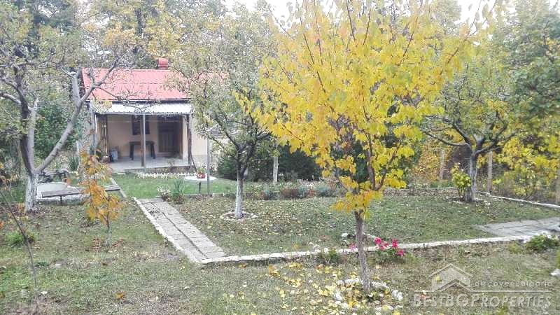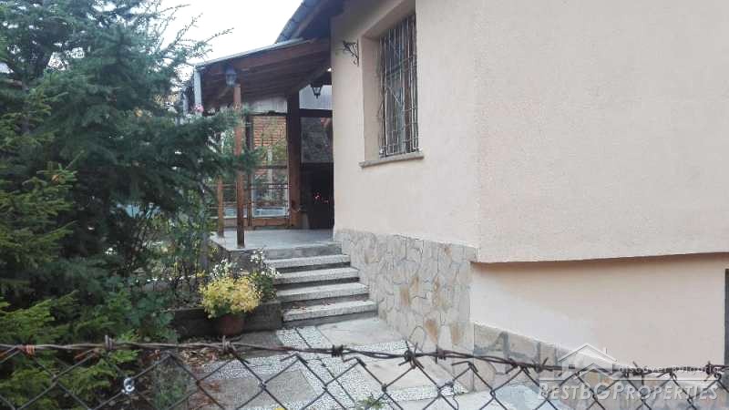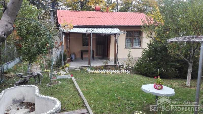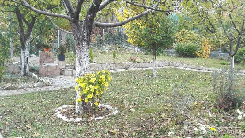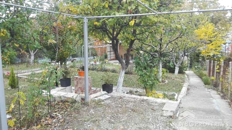 The house has total living area of 70 sq m. It is built on a plot with size 420 sq m. The yard is terraced and well maintained. It includes many fruit trees, pine trees and decorative shrubs. There is also a small pond with fountain and a parking space.