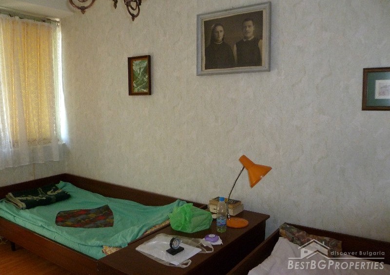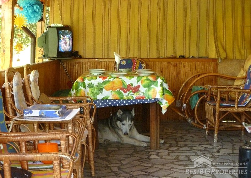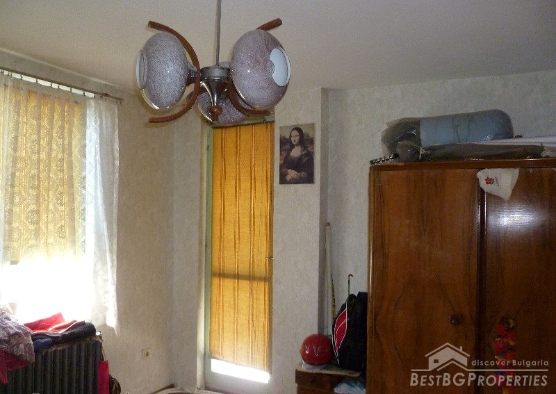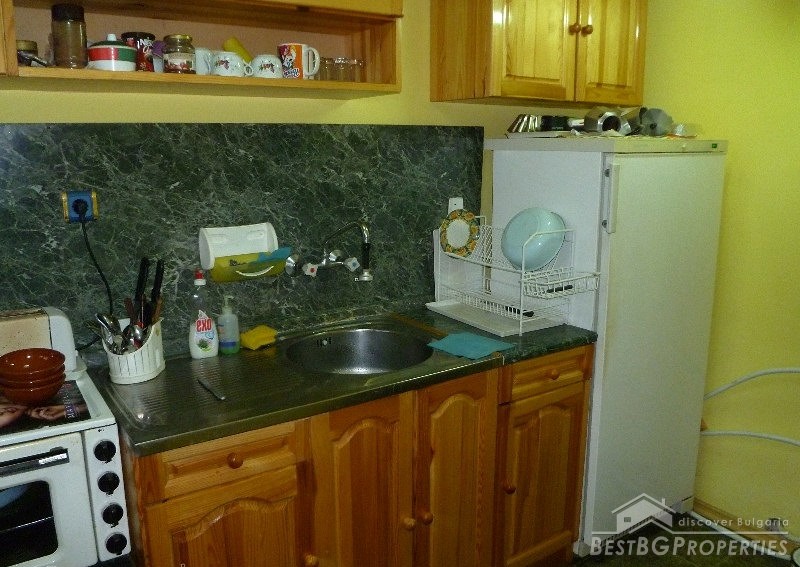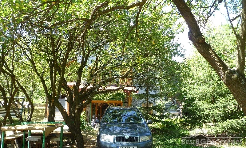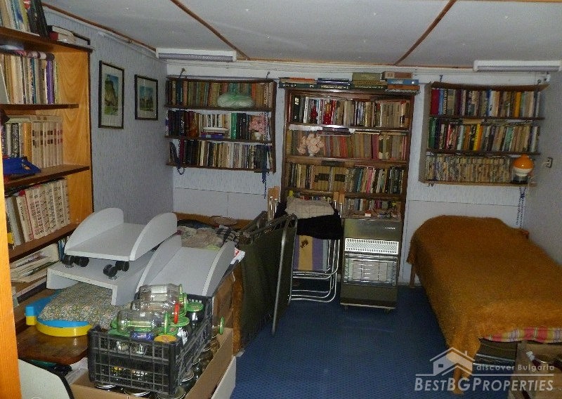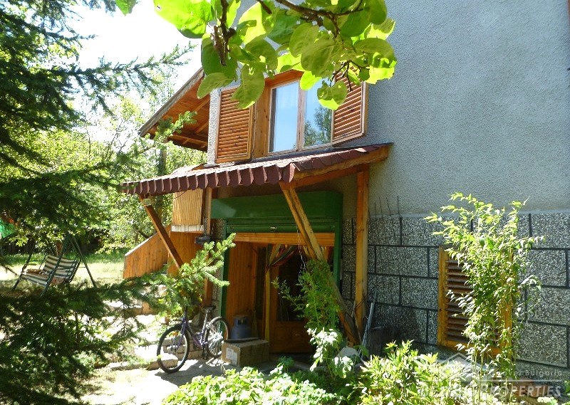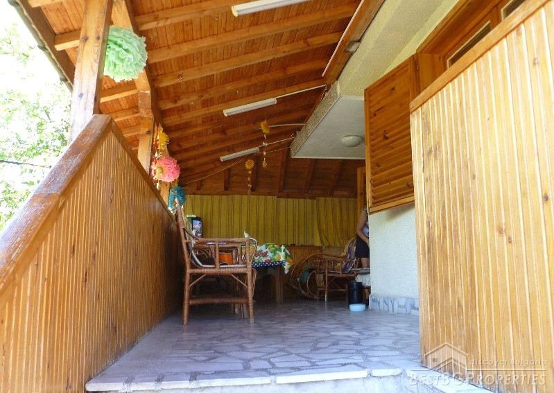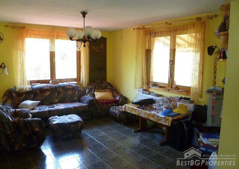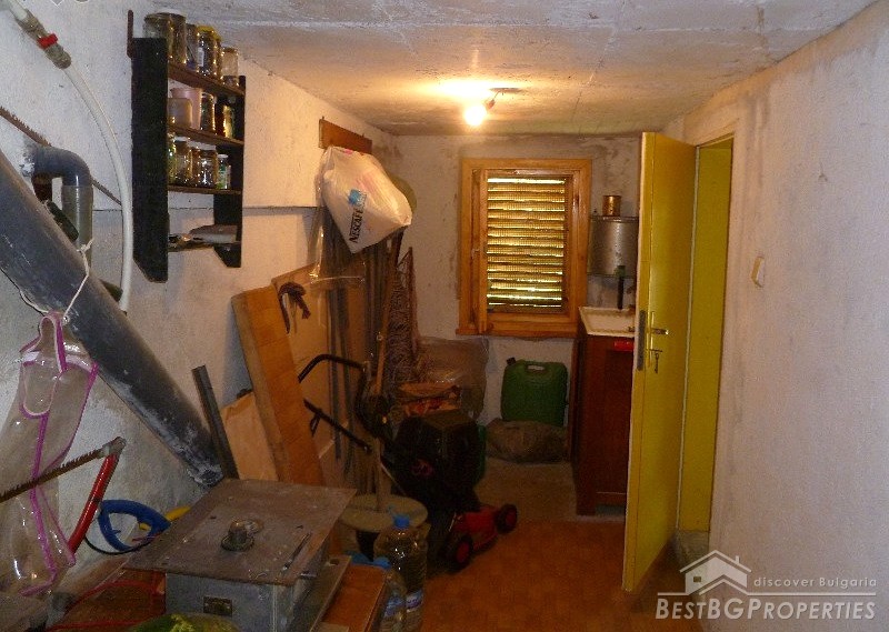 The property comes with a 500 sq m landscaped yard with many fruit trees. The house is brick, built in 1985, on two floors each with size 40 sq m and with 20 sq m covered terrace. The first floor consists of a kitchen, living room, bathroom and a toilet. The second floor has 2 bedrooms with terrace. The house has central heating via a fireplace on wood and coal with water jacket. There is also a ground floor consisting of a separate bedroom and next to it there is a basement and a workshop. The house is fully furnished.