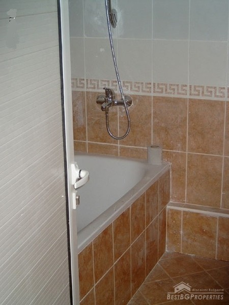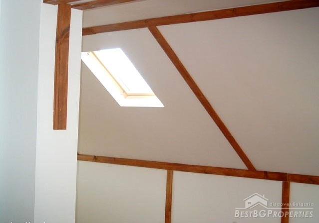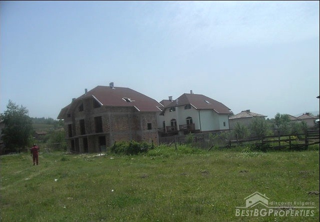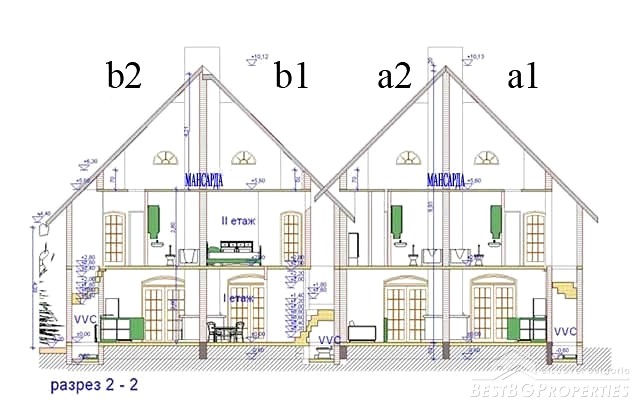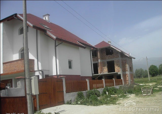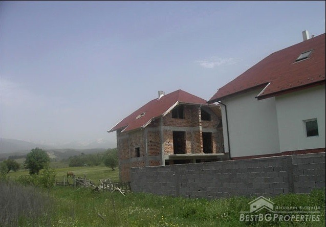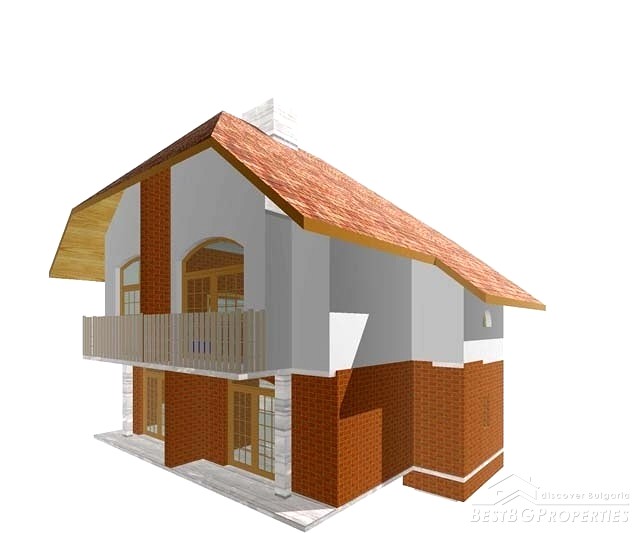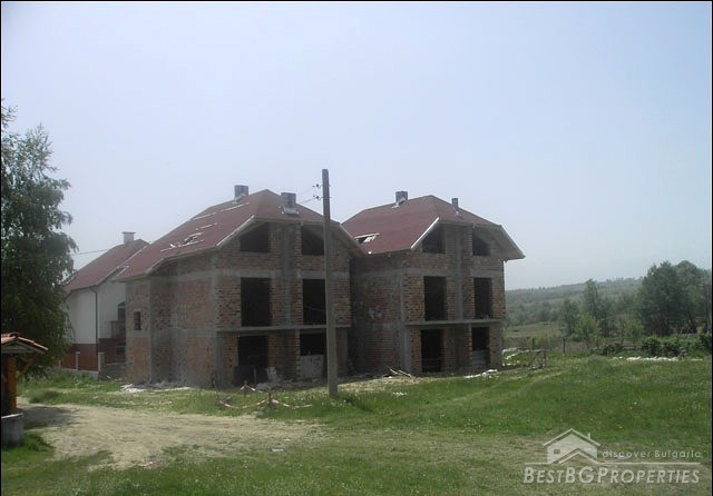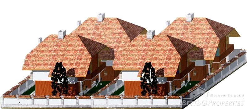 The houses for sale are four. Only one is completely finished and has act 16. The others are on act 14 stage of completion. Each house is built on a plot 600 sq m which comes with an open air swimming pool. The houses are two family type, which means that each hose is divided on two equal parts with own private access. Basicly each house is divided on two separate trisonetts, since the houses are three storeys high. The trisonetts can be sold separately or you can buy the whole family house together. Each trisonette has total living area of 129 sq m. The whole house has area of 260 sq m. The first floor comprises a kitchen, dining area, living room with fireplace, bathroom with WC, inner staircase. The second floor includes two bedrooms, two bathrooms with WC, service premise, and two balconies with marvelous views. The third floor is a separate mansard premise which is connected to the other floors with and spiral staircase. There is a panoramic window on the roof. All houses are with southern exposure and beautiful Mountain View. The property is situated in a valley at the end of the village. 50 meters from the plot there is a river, 500 meters away are the borders of the new golf course.