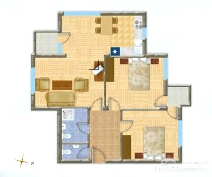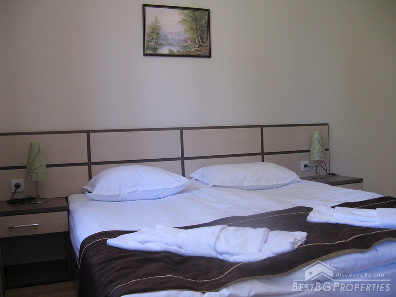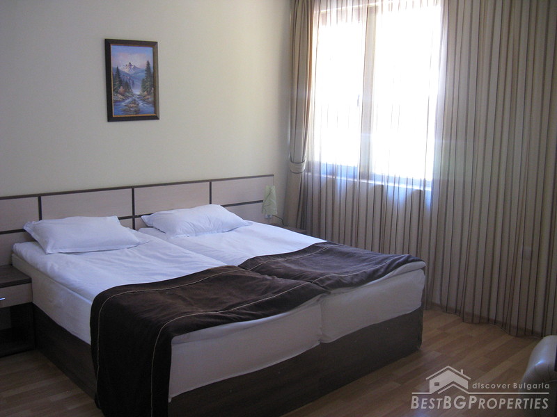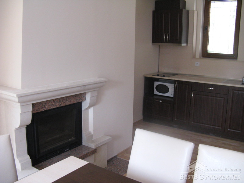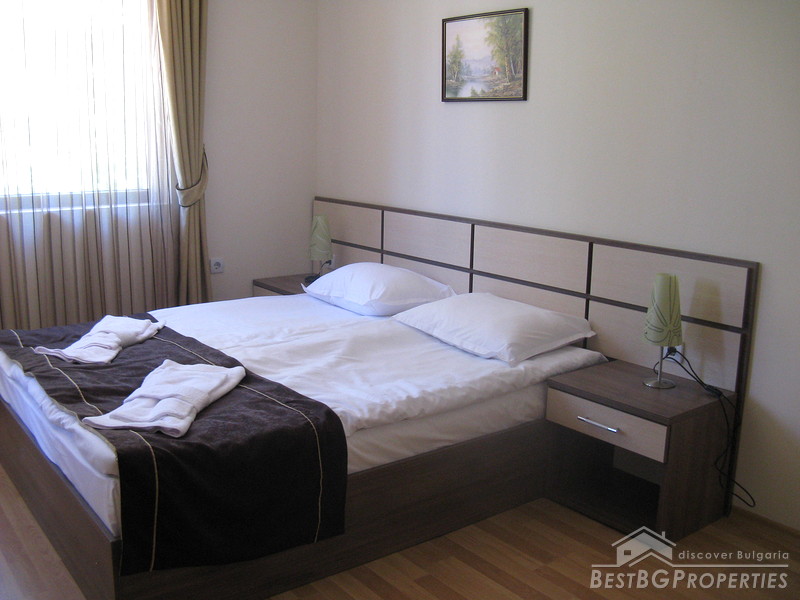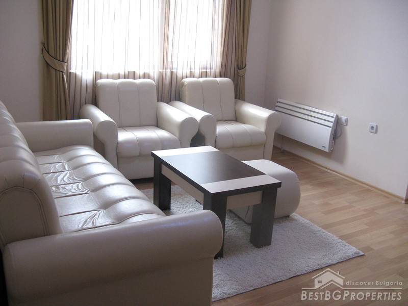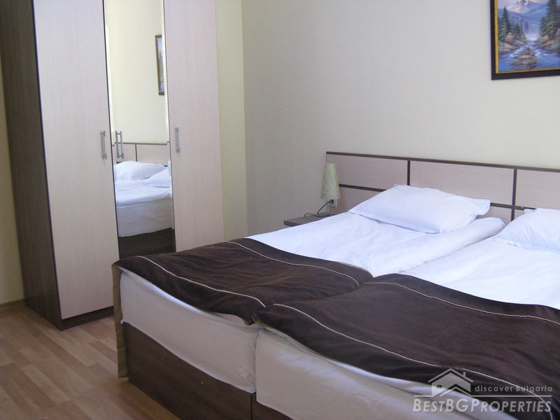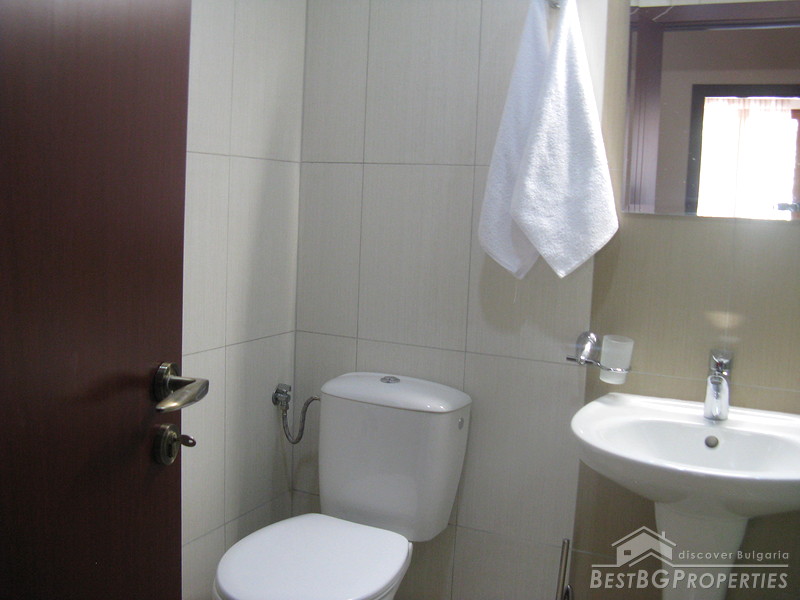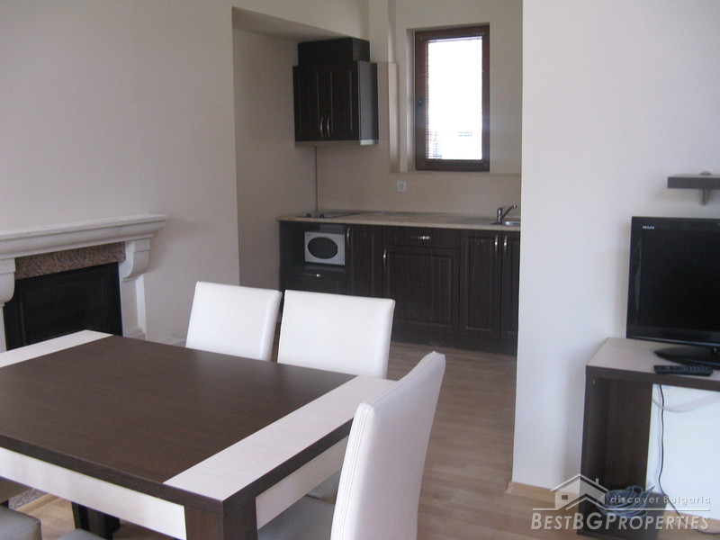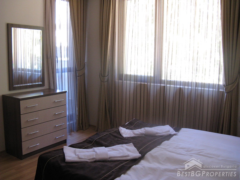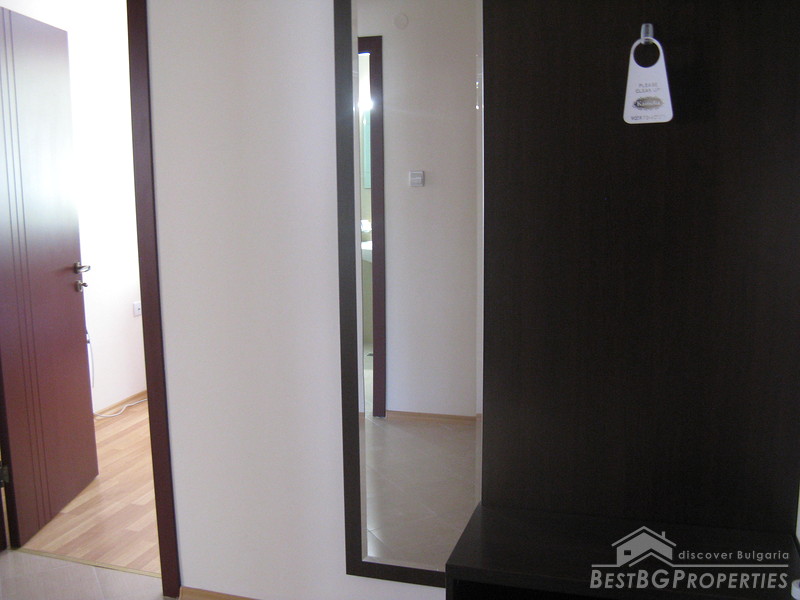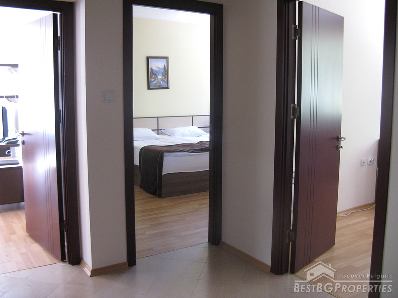 The offered apartment is two-bedroom type and comprises total living area of 108.43 sq m. It is situated on the eight floor of the complex. The apartment is for sale completely furnished and ready to move in. It is equipped with kitchenette combined with living (sleeping sofa) and dining area, TV, Internet, phone, fireplace, bathroom with shower, separate WC. The kitchenette is equipped with refrigerator, microwave, hot plate, water kettle, coffeemaker, iron board.
