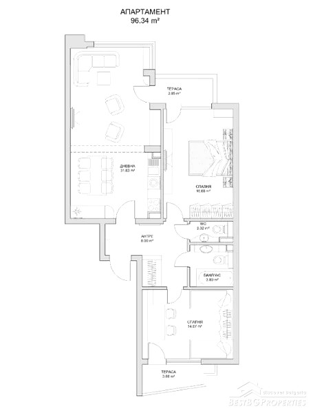 The apartment consists of a living room with kitchenette and dining area, two bedrooms, bathroom with toilet and jacuzzi, toilet and two balconies. The living room and one of the bedrooms have a balcony facing southwest. The second bedroom also has a balcony facing northeast. The total living area is 96.34 sq m. The price also includes a basement of 5.40 sq m and ideal shares from the yard - 10%.
