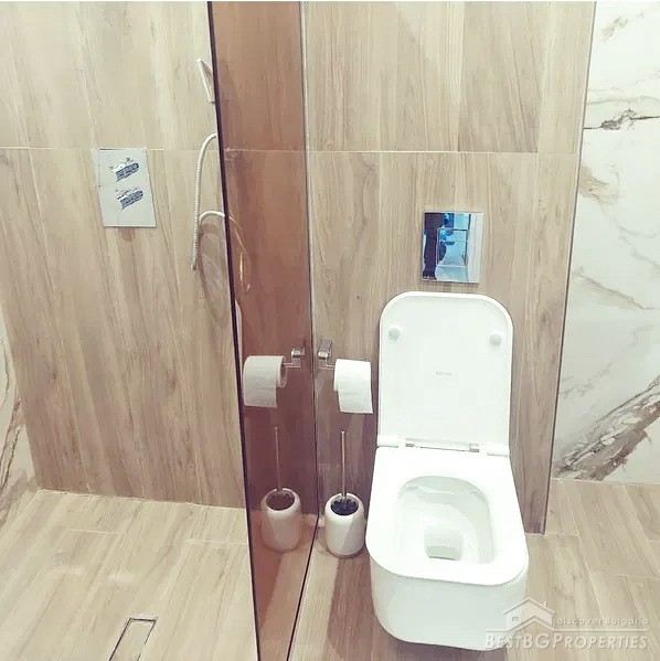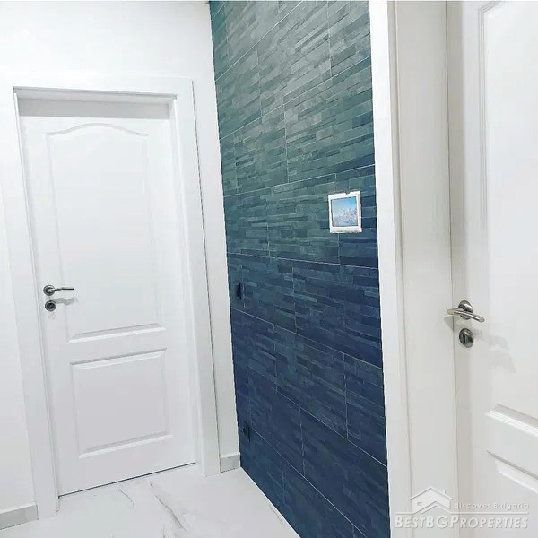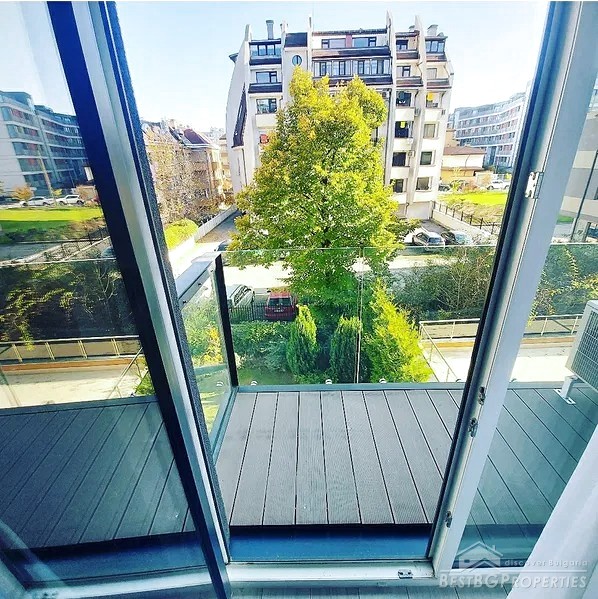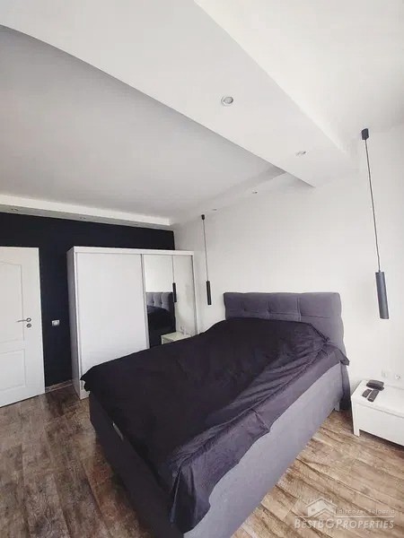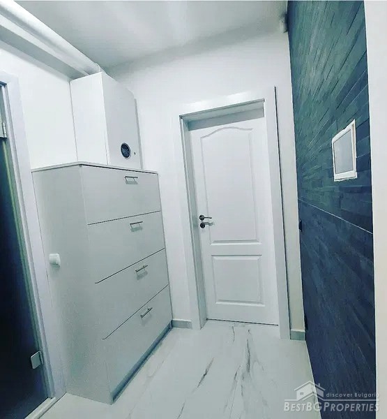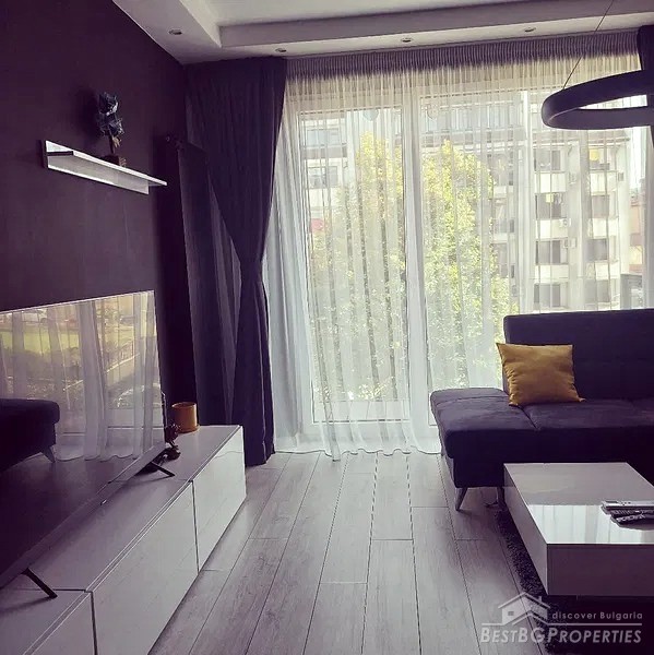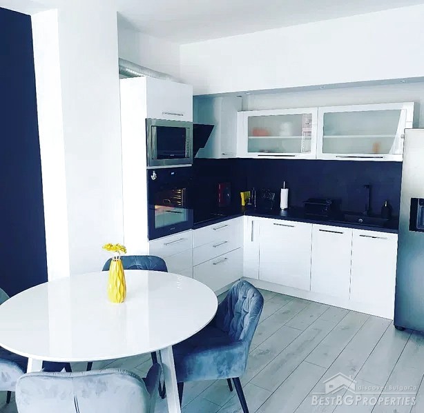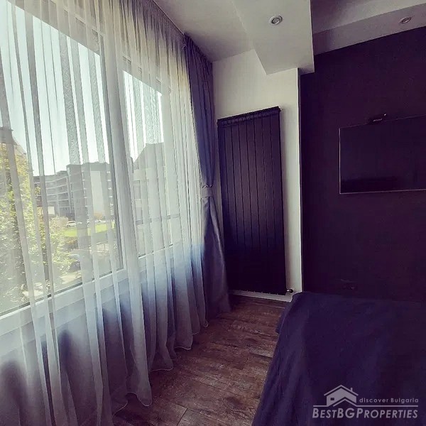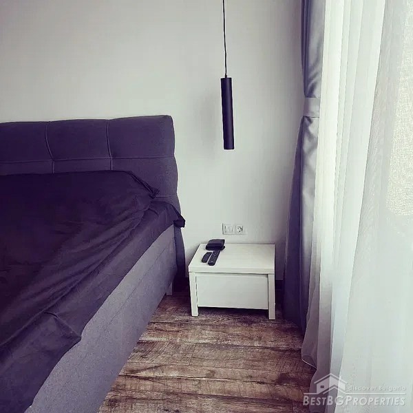 The apartment is facing east. It is designer finished and furnished with class A + appliances. All are under warranty. The property consists of a bedroom, bathroom, hallway, living room with dining area and open-plan kitchen. There is also a terrace with a partial view of Vitosha Mountain.